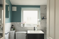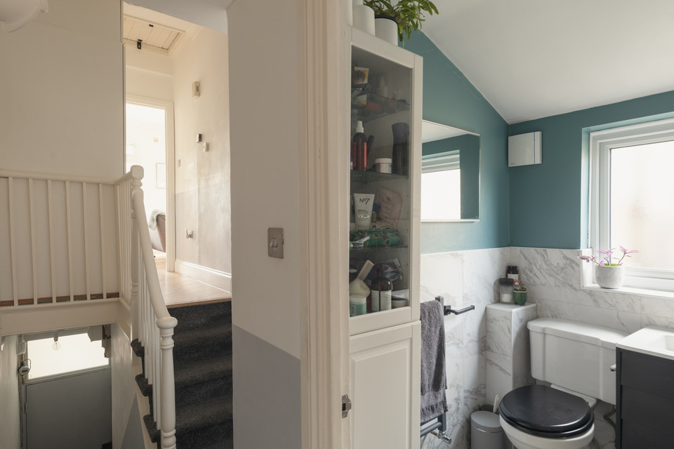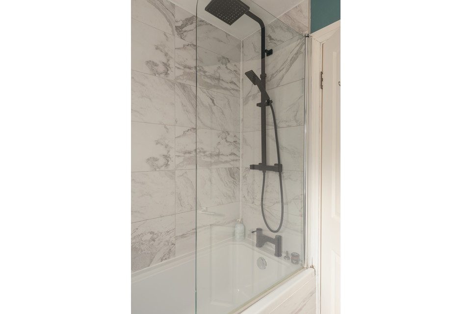 Next door is your smart and windowed bathroom with faux-marble tiling, white sanitaryware, and on-trend monochrome fittings including the over-bath shower.