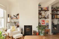 Up to the main landing and you have custom-made storage cupboards, next to the door to your east-facing, twin-windowed reception room. This is 15 feet by 11 feet, with plenty of space for your sofas. An opened-up fireplace hosts a wood-burner. A warming focal point. Engineered oak set on an angle is a further pleasing feature.