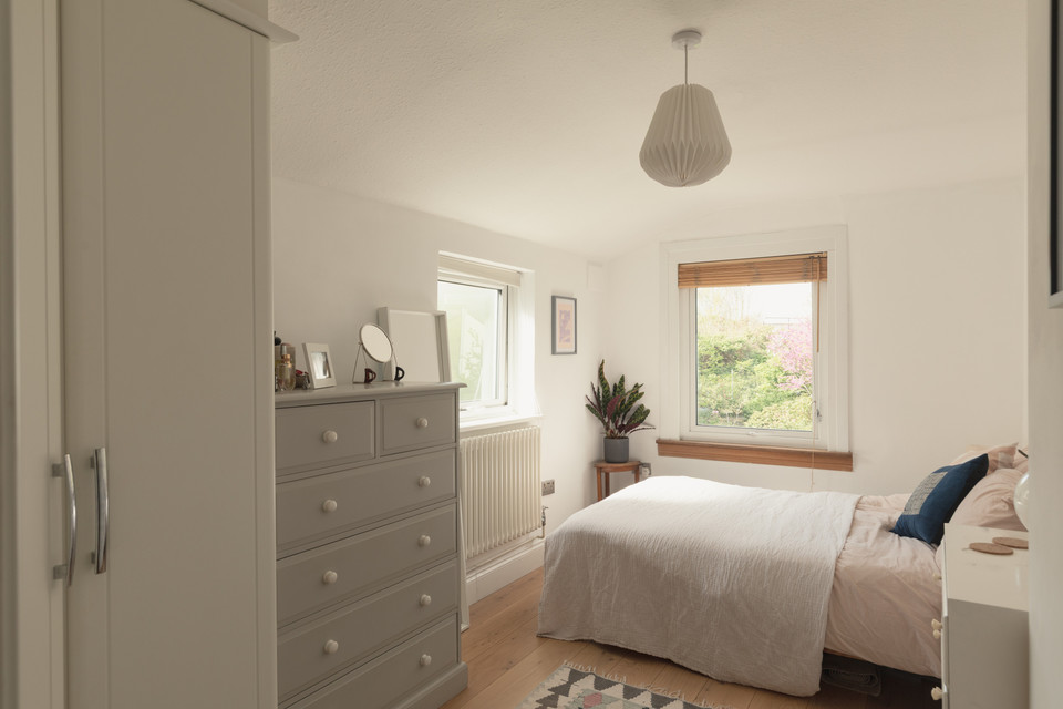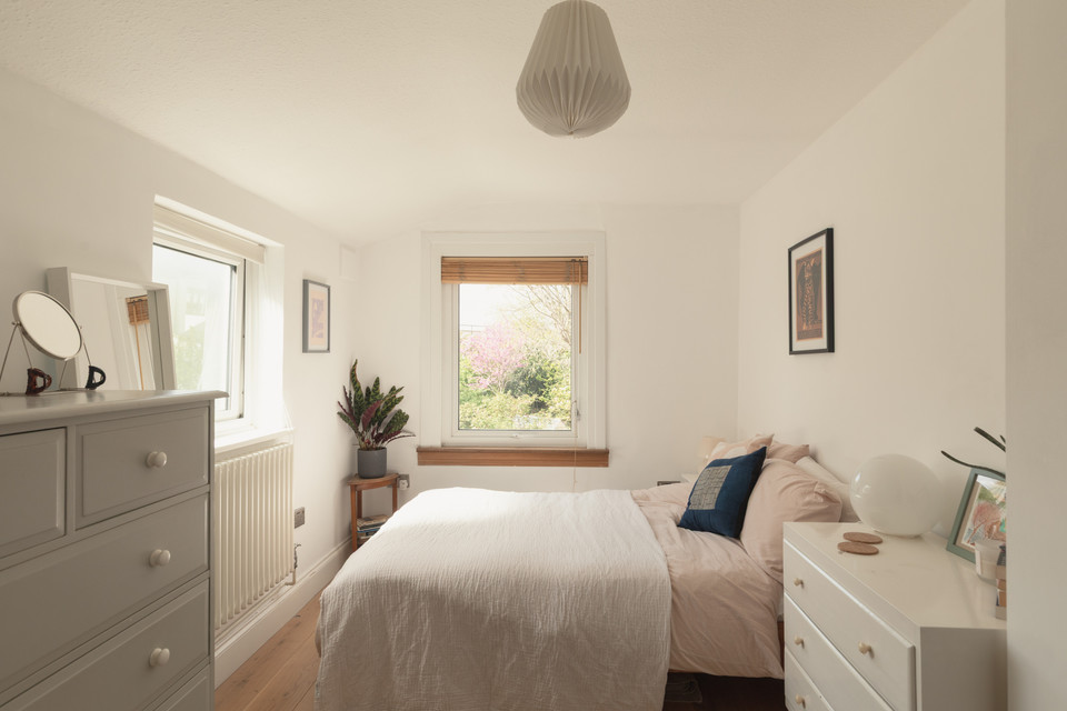 You share a hall with just the one flat under yours. Open your own front door and take the stairs up to a half-landing area. From here your delightful double-aspect bedroom is set to the back of the building, of over 16 feet by over 8 feet, with a fitted three-doored corner closet. Engineered oak flooring impresses.