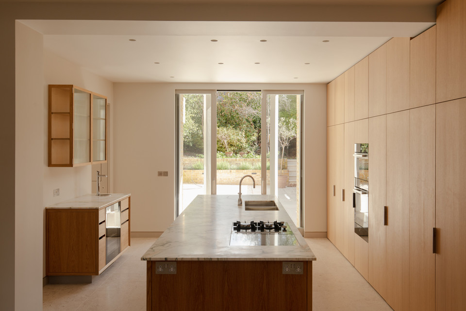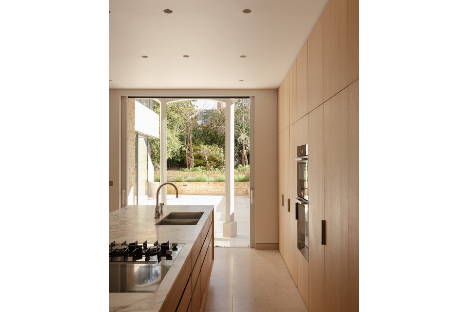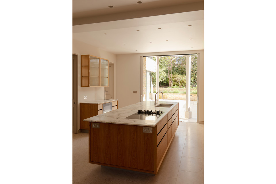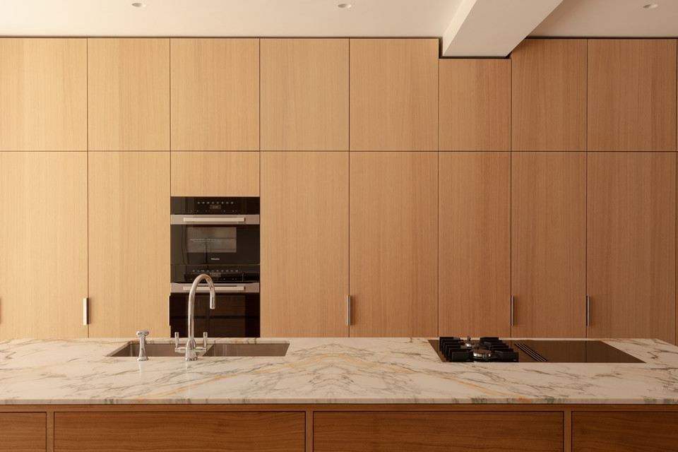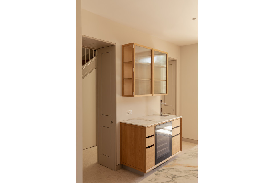 The main event on this floor though is the kitchen/dining room. It's a total knockout. The unbelievable, absolutely brand new fitted kitchen has hand-crafted solid wood units, a central oversized island, solid marble counters (immaculately-fitted), and high-end integrated appliances and fittings. You’ll note the high ceilings down here as well. This is no light-touch renovation!
