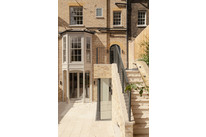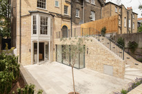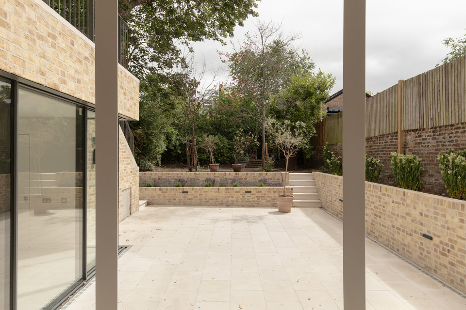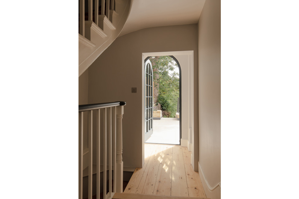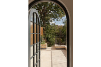At the end of the hall, open a gorgeous arched glazed door to a sleek terrace which extends 14 feet. Stairs lead down from here to the garden proper.