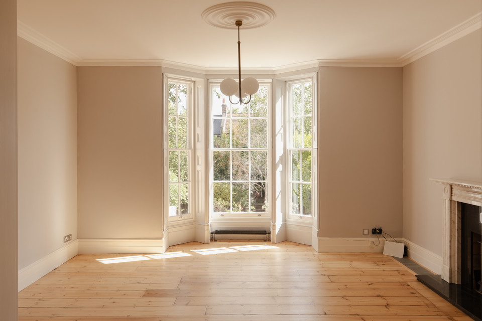 Your formal double-reception rests to your right. Both rooms are massive, and coving and rose detailing, oversized sash windows and painted timber shutters are the order of the day (we are swooning over the bay window onto the garden!). Both fireplaces host gas-fired stoves.