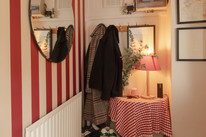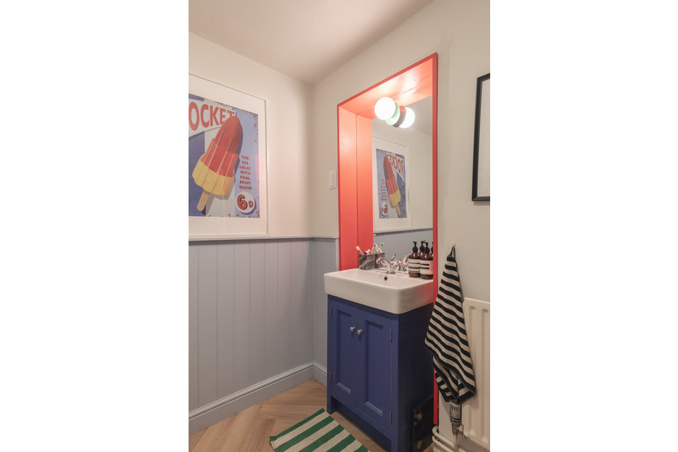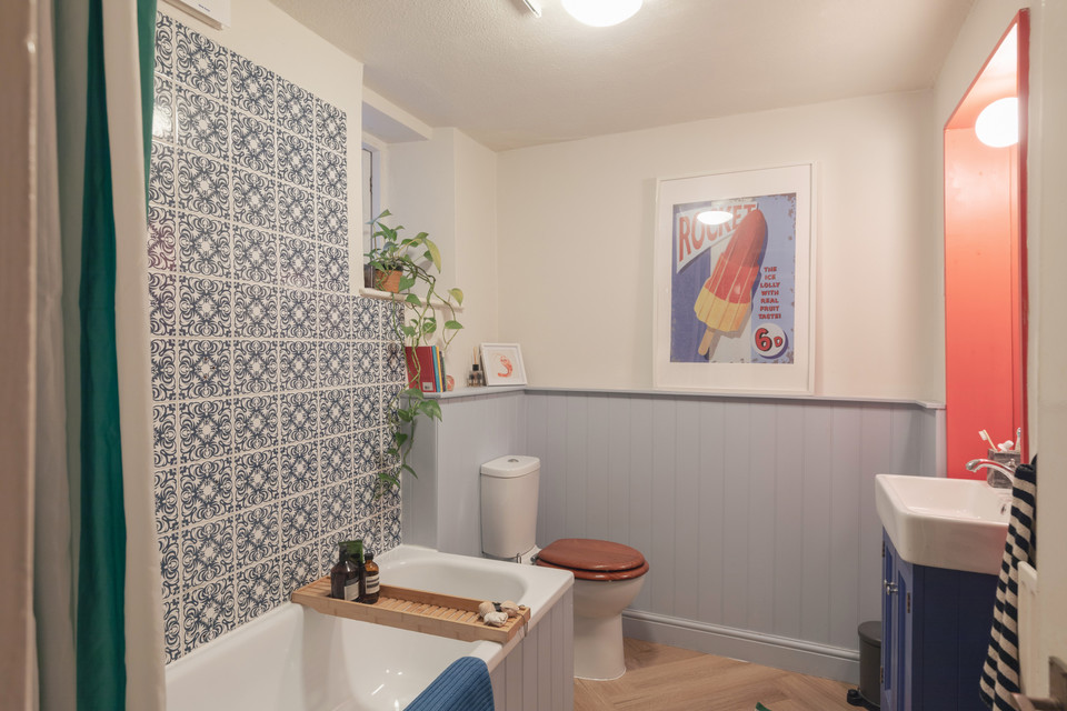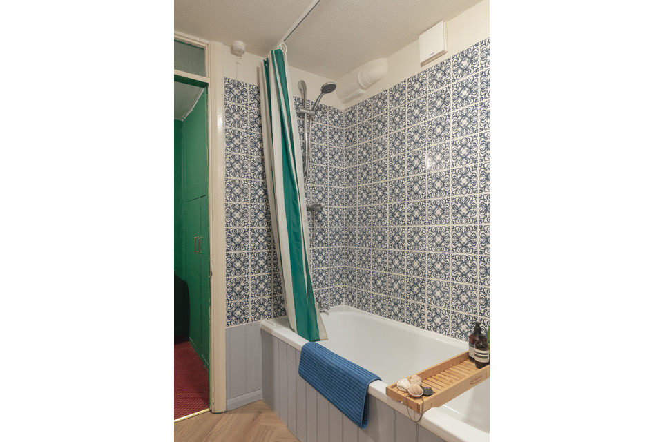 Your bathroom is on your right, with a new bathroom sink plus new panelling, mirror and light, and a re-enamelled bathtub. Decorative tiles further impress.