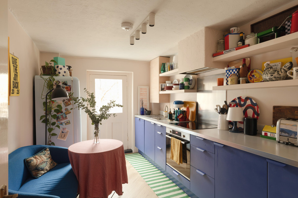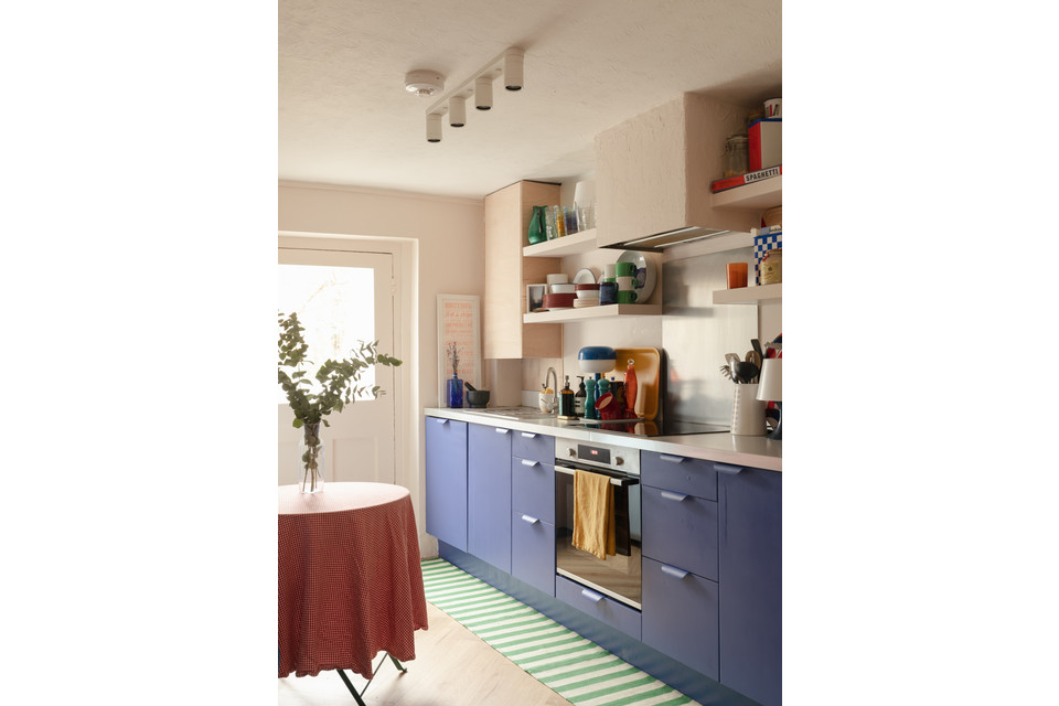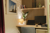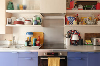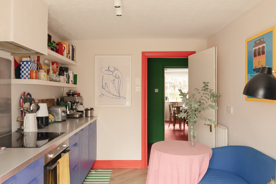 Your kitchen sits next door. A new dishwasher and water filter have been recently fitted, and are included in the sale. A bank of built-in fitted kitchen units are paired with four open shelves. There is space for a table and chairs for an extra option for casual dining/coffee and papers.