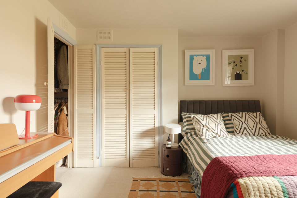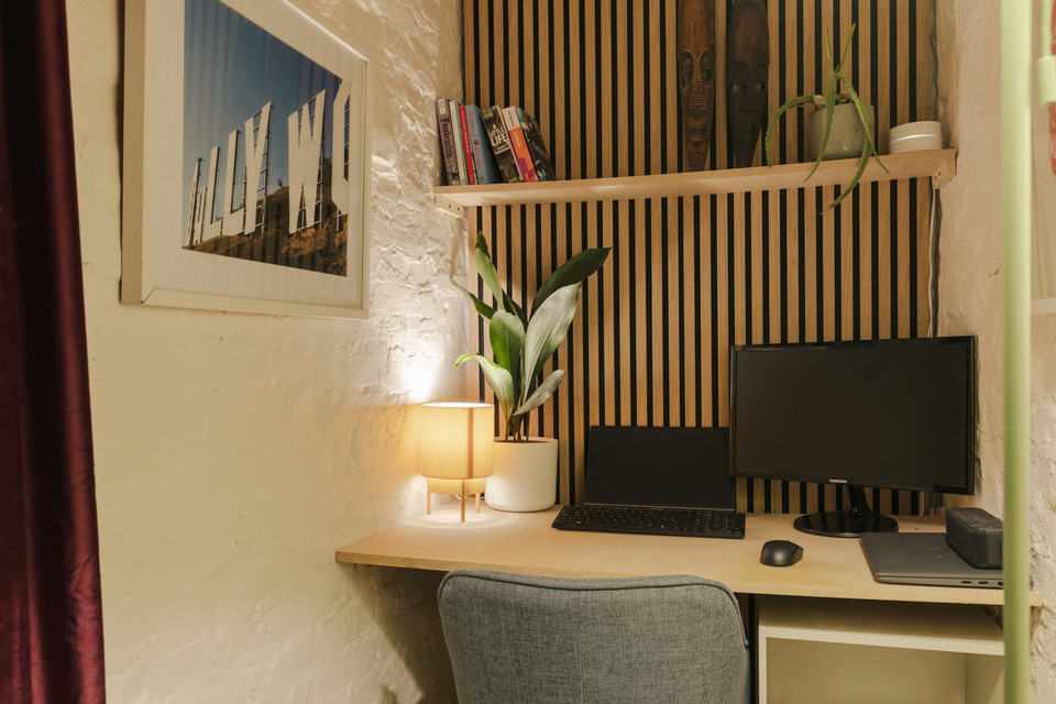 Leaving this room, you happen upon a central lobby, which hosts a cute dedicated study area and a large fitted storage cupboard (plumbed for and containing the included washer and dryer).