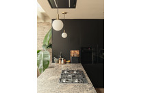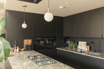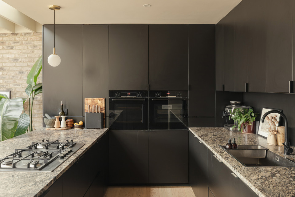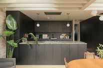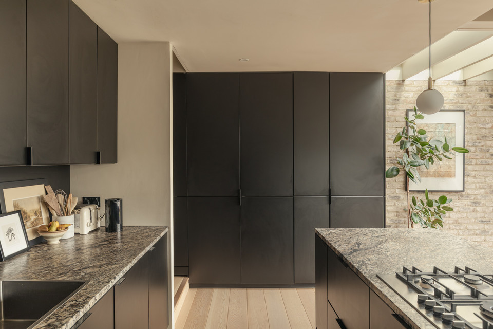 At the foot of the hall, open your sliding pocket door to the main event: your huge open-plan kitchen/reception room (of over 22 feet by over 17 feet), which lends itself very obviously to entertaining your favourite few through to a throng! In the kitchen area, black matt fitted units (enjoy cupboards and deep drawers here) are in their many, and offer loads of storage as well as hosting high-end Bosch integrated appliances. Gorgeous Indian granite counters feature for added luxury.