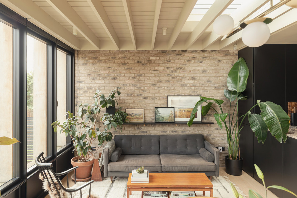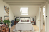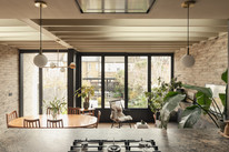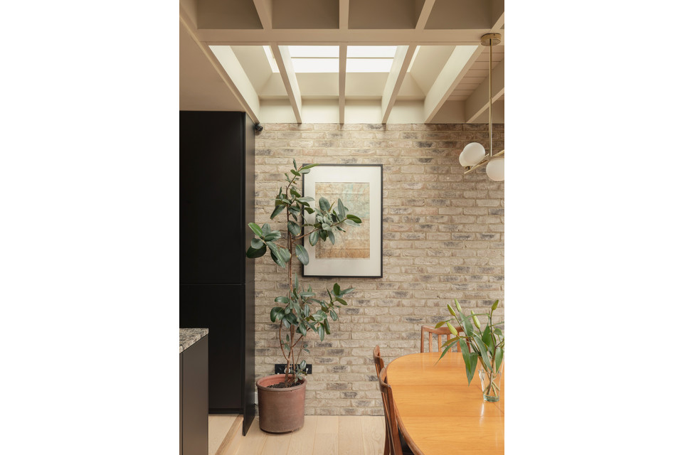 It is down one step for your reception area. Exposed brick walls impressing here, and two Velux roof lights (with rain sensors) further illuminating the already bright room. Exposed painted timber beams/fins (with a boarded finish) to the ceiling are yet another welcome decision.