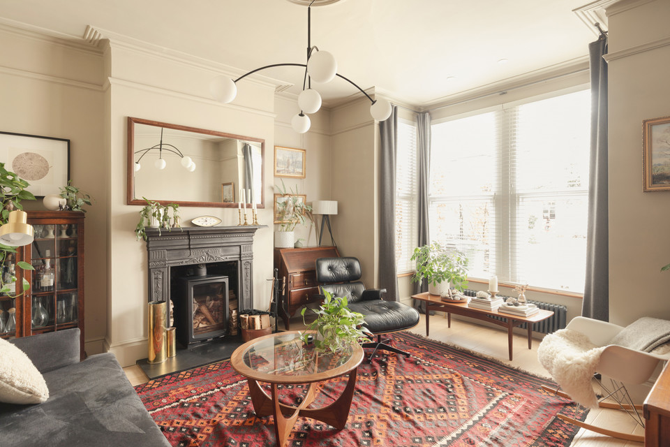 You open into an impressive high-ceilinged hall – eyes drawn to the incredible main room ahead. But before we get to all that, to your right is a traditional front room, of over 15 feet by over 14 feet, with a big square bay window and a beautiful original cast/iron fire surround with slate hearth and central wood-burner (DEFRA approved). Further pleasers include engineered oak floors, coving, rose and picture rail detailing, and a slim column radiator (column radiators impress throughout the house).