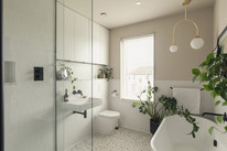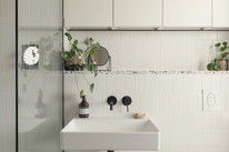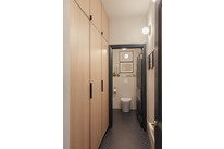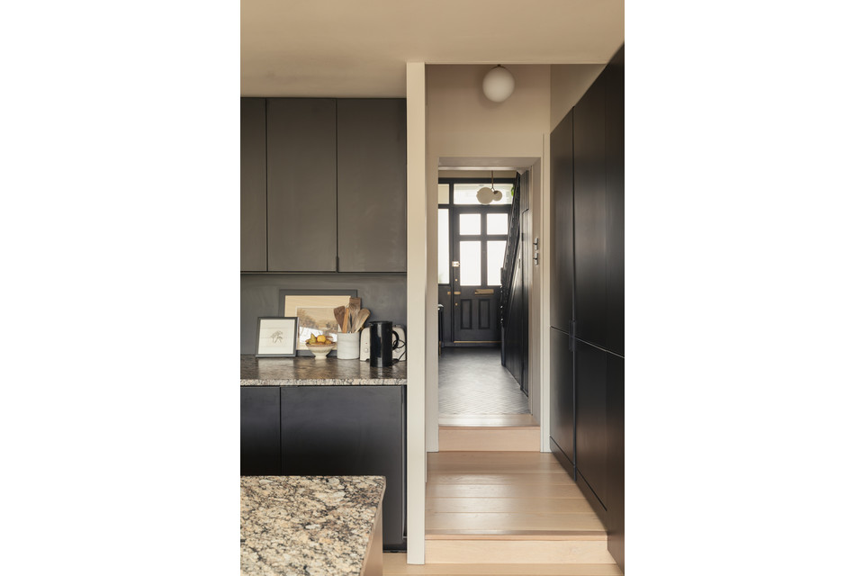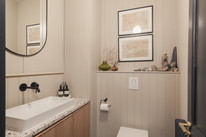 Next to your right from the hall is an independent plumbed utility room, with oak joinery concealing an integrated full-height Bosch freezer, washing machine/dryer space, and ample full height storage. Beyond is a guest/downstairs w.c. with Italian terrazzo countertop and Duravit basin.