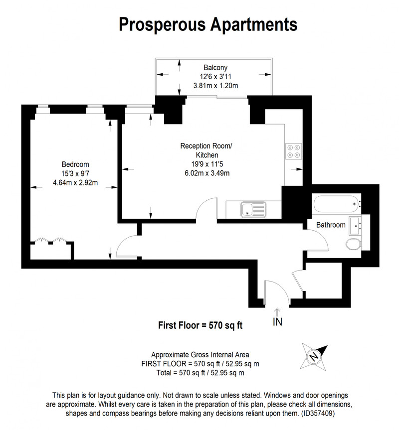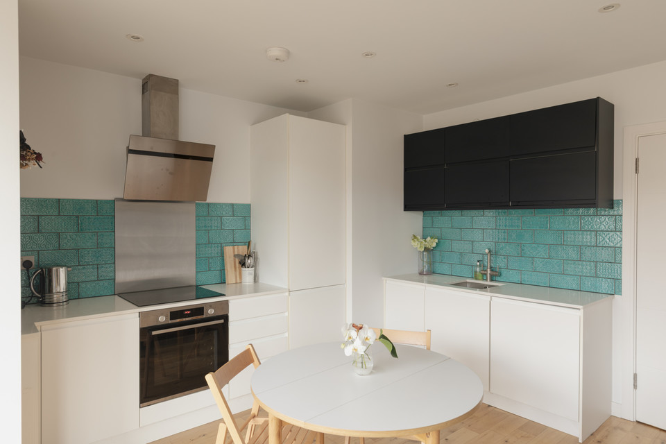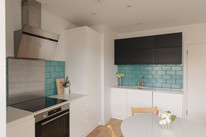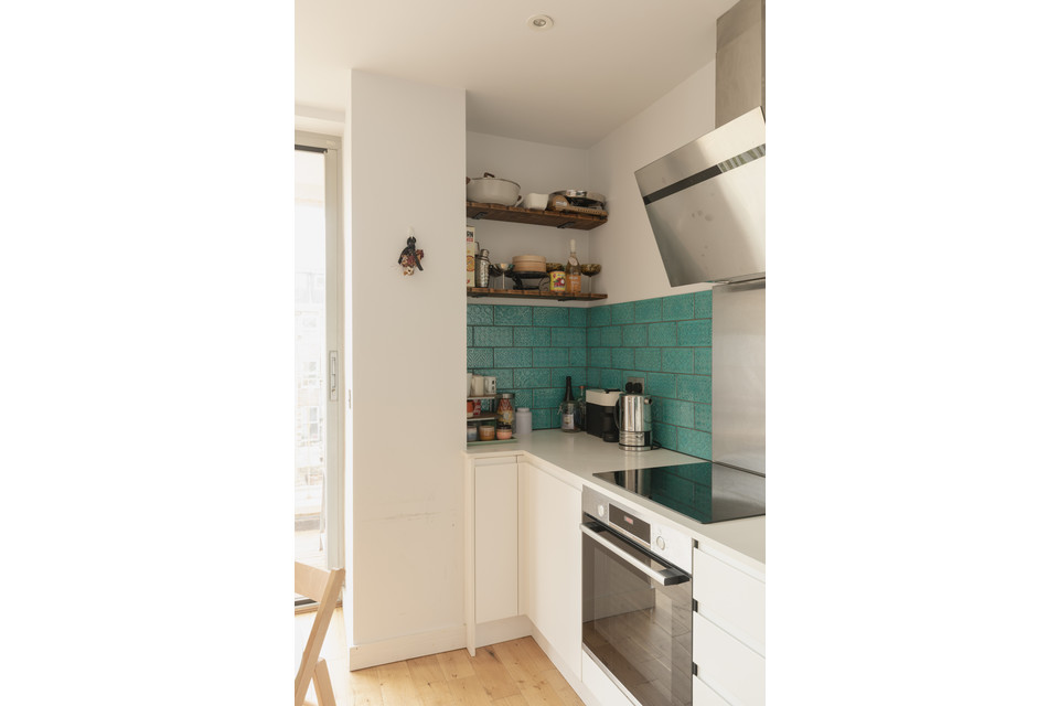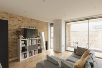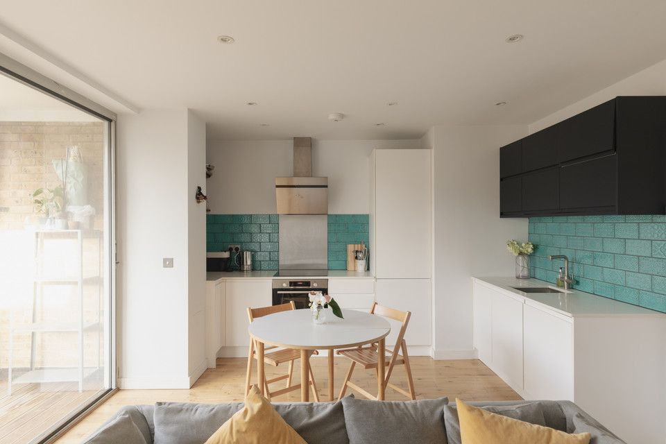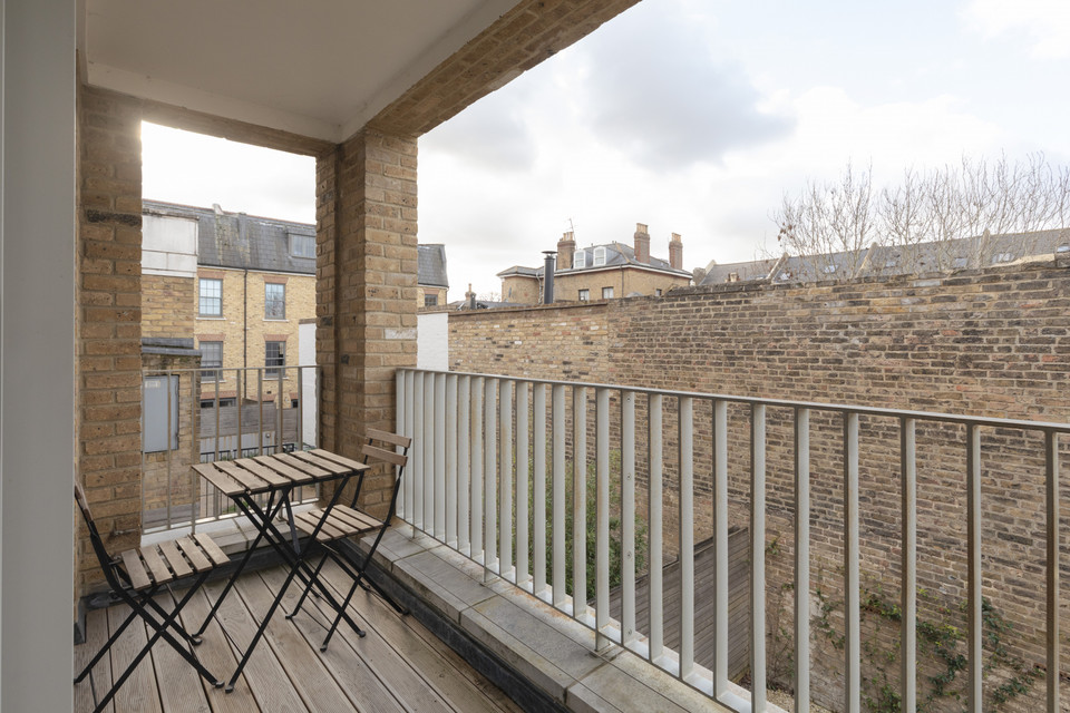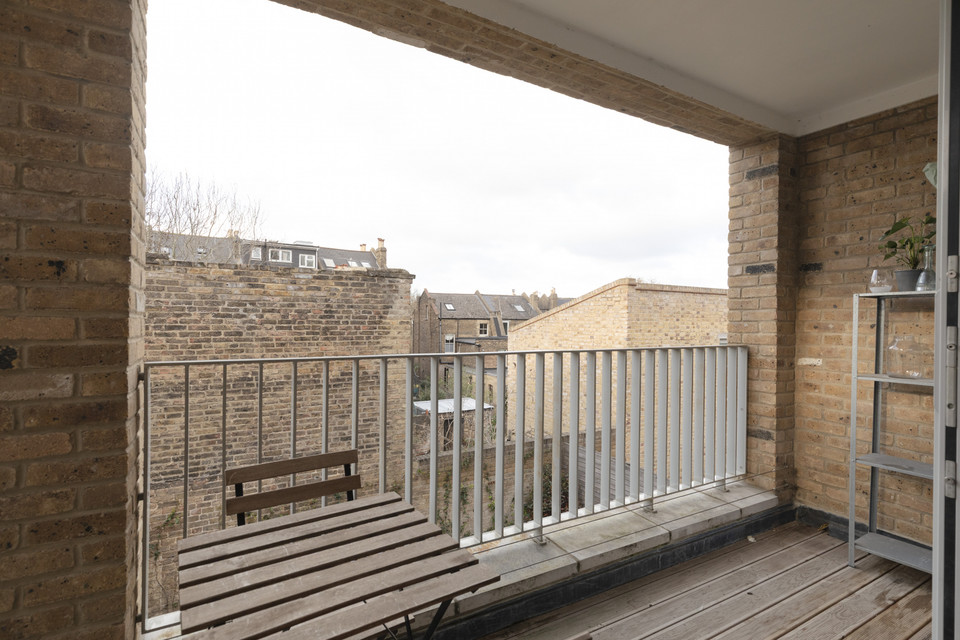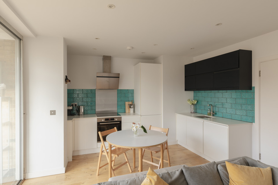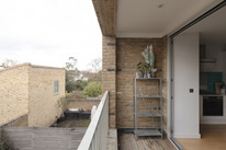 Next up is your large main room, of nearly 20 feet by over 11 feet (plenty of space to zone dining and seating areas), with a cool exposed brick wall to the reception end. Find your modern kitchen to the opposite end of the room - with neat units in black and white, and integrated appliances (these are included in the sale). Engineered oak impresses to the floor, and as throughout, walls are a crisp white. Huge double-glazed sliding doors deliver you to your private covered balcony.
