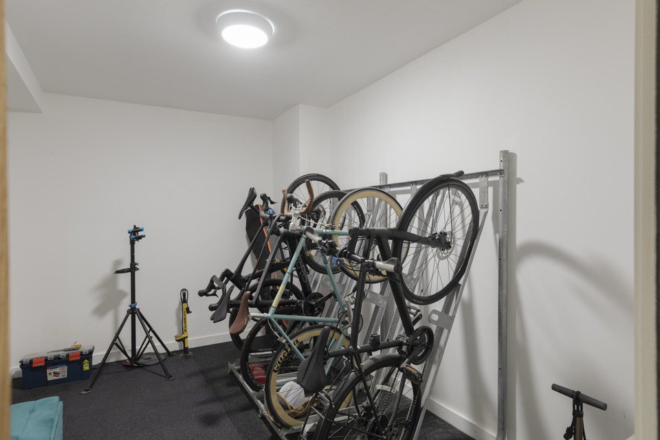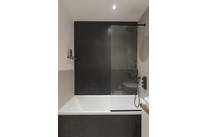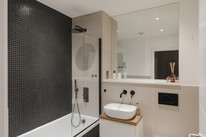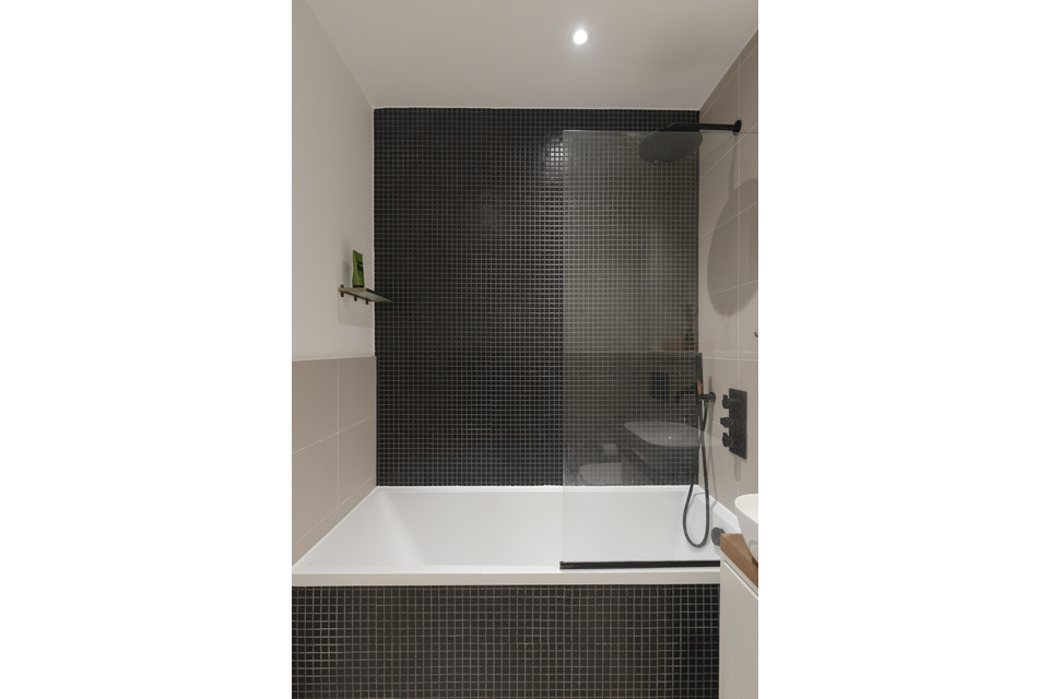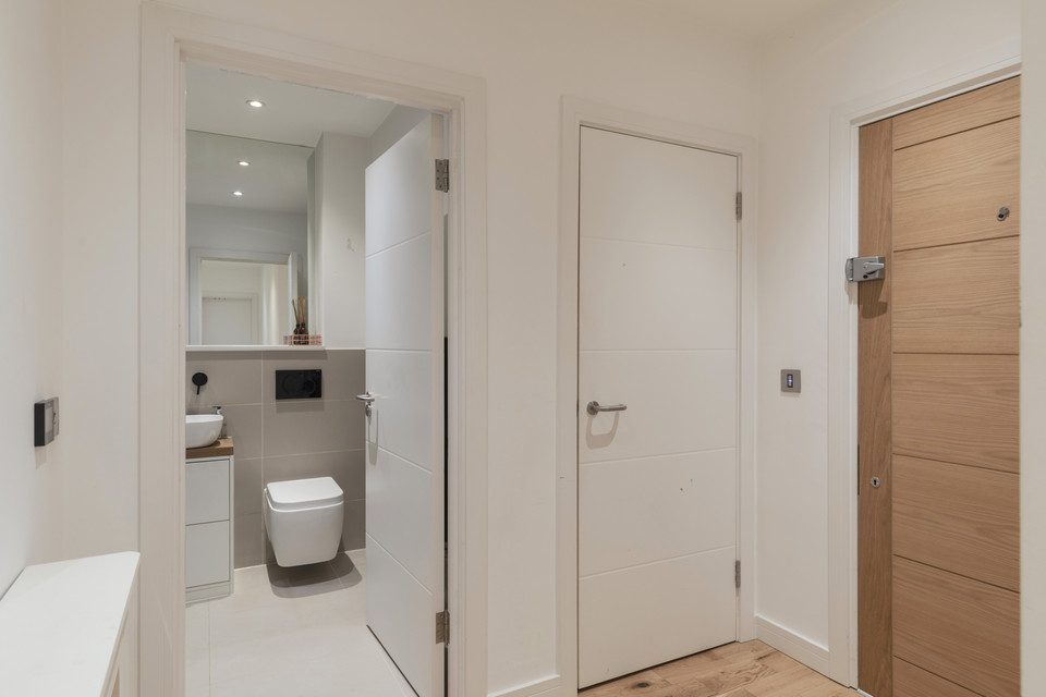 Take the stairs to the first floor where you’ll find your own front door. From the hall you have a generous coat/cleaning cupboard to your immediate right. Next on your right is the immaculate internal modern bathroom, with contemporary suite and fittings (we love the on-trend monochrome detailing).