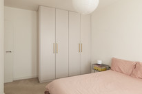 At the end of the hall, find your most-pleasing carpeted double bedroom, of 15 feet by over 9 feet. A bank of built-in (to-the-ceiling) closets sit at the near end.