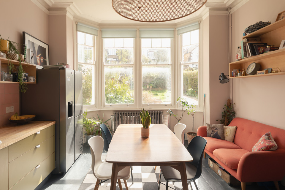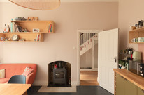 In your own front door and you arrive in your windowed hall, high ceilings impressing from the off. On your right is a splendid kitchen/dining room, of over 17 feet by over 13 feet, with a wood-burner, and a recently-fitted custom-made kitchen with wooden worktops. A huge bay window (column radiator here) makes the most of the seriously-sunny orientation. It is a fabulous room for quiet family breakfasts through to busy dinner parties with friends.