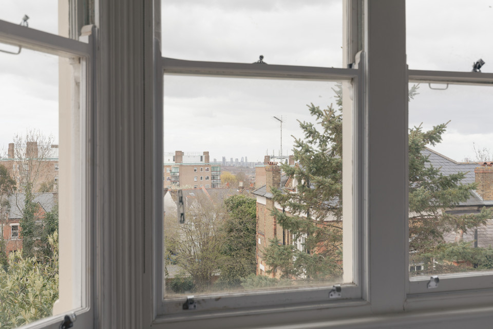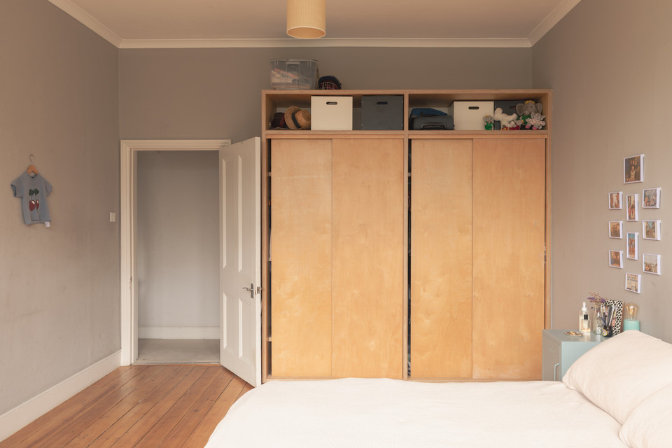 The sizeable first floor further impresses. You have a principal bay-windowed bedroom to the front of the building, of over 18 feet by nearly 13 feet. Large bespoke built-in closets grace the near wall.