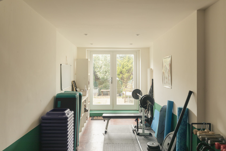 Down the stairs by the office door and you will find a neat shower room and a home gym space, which has double-doors opening onto a paved garden area. A pathway at the end takes you round to your third garden space and store (which is fabulous for storing garden furniture, bicycles and suchlike).