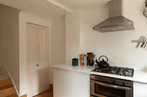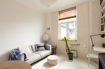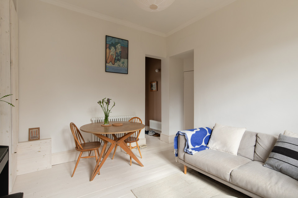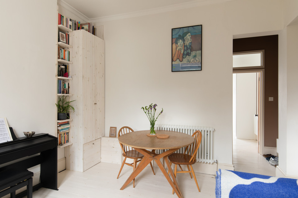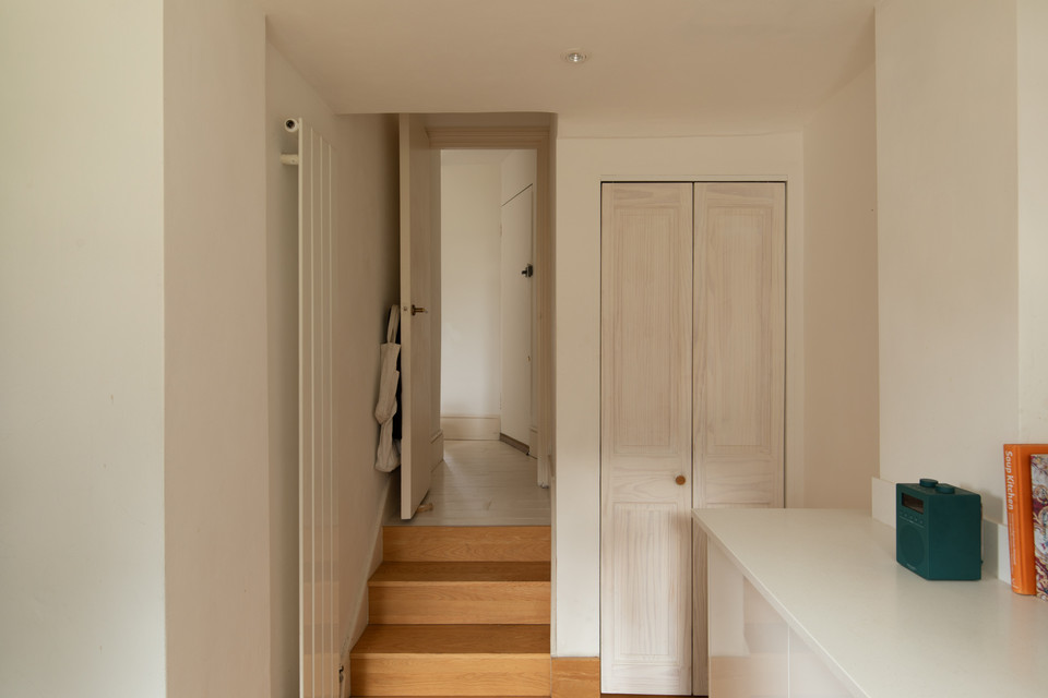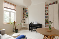 Internally, a wide shared entrance hallway opens to the flat, on the right. You are welcomed immediately by a generous and high-ceilinged sitting room of over 12 feet by over 11, with a large window overlooking the garden. Painted wooden floors, chalky walls, and bespoke bleached wood shelves continue to celebrate the light and bright theme.
