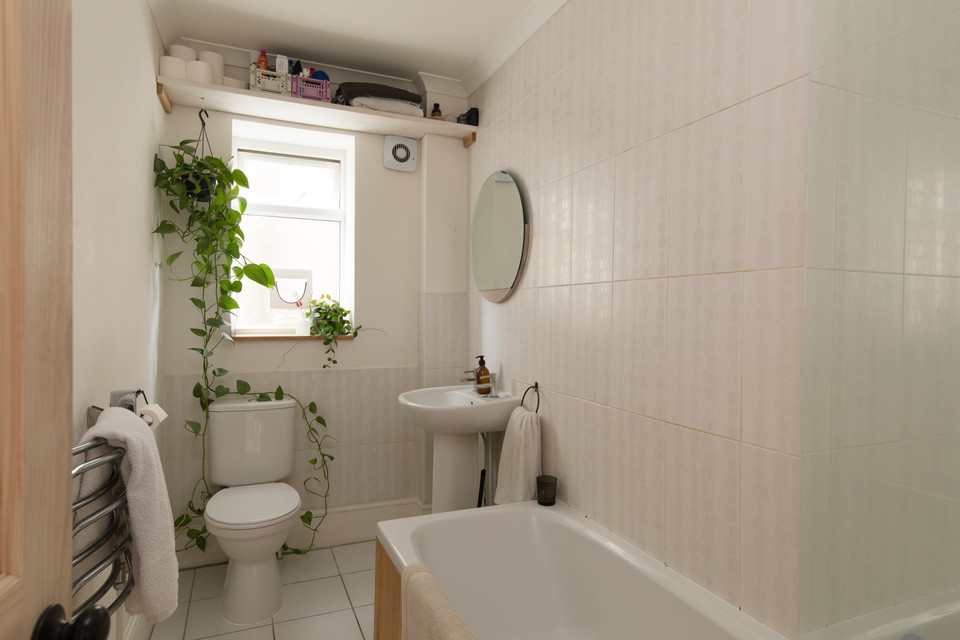 Beyond the living room, to the right, a useful hallway space for jackets and shoes opens onto a neat and neutral bathroom, with underfloor heating and a window.