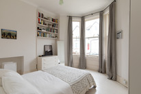 From there, a good sized double bedroom of over 12 feet by over 11 reintroduces the high ceilings and pale wood and walls, and a new timber-sashed bay-window looks out onto the street below.