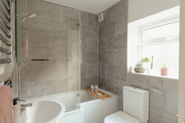 Back inside and beyond the kitchen you have your (double-glazed) windowed bathroom. This has contemporary sanitaryware and fittings, large profile tiling, an over-bath shower and a stainless steel heated towel radiator. This concludes our tour.