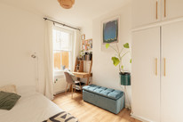 Adjacent is the second bedroom - another good double (of over 10 feet by over 9 feet). A fitted wardrobe features to the near alcove, and a sash window looks out to the side-return area of the garden.