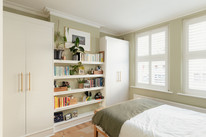 From the shared hall your own front door rests to your right. The door straight ahead opens into your principal bedroom, of over 10 feet each way, with built-in wardrobes to both alcoves, and open shelving between the two across the chimney breast (nice touch). Custom-made shutters grace your sash windows.