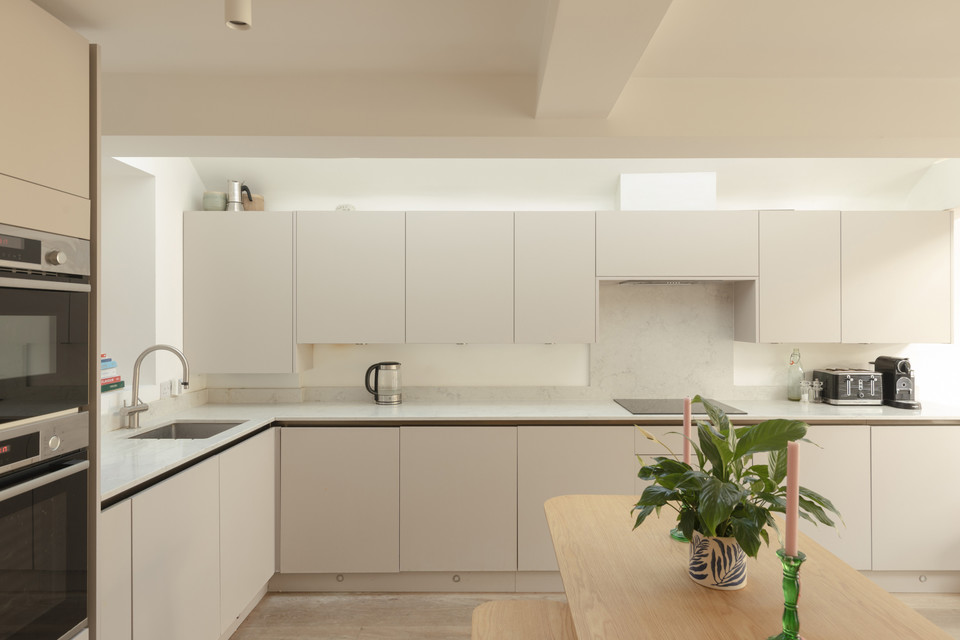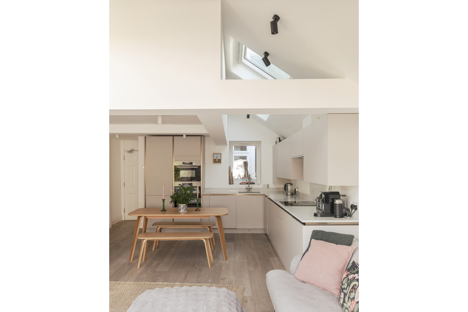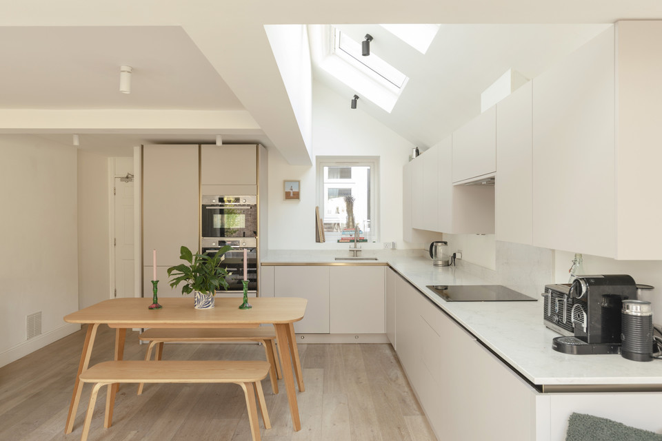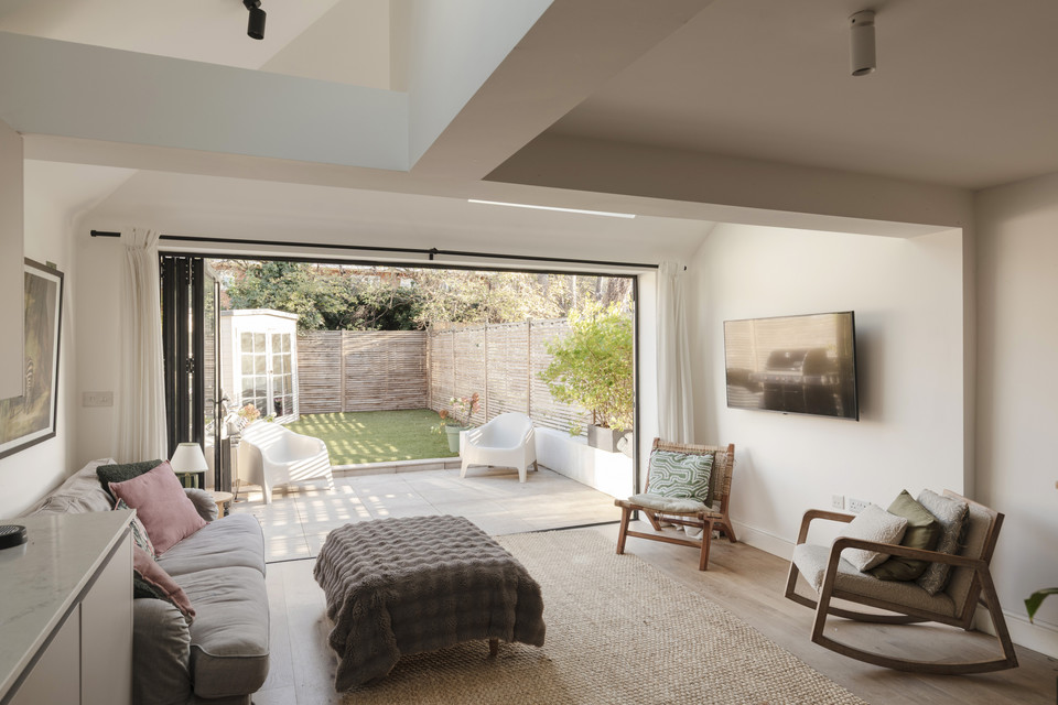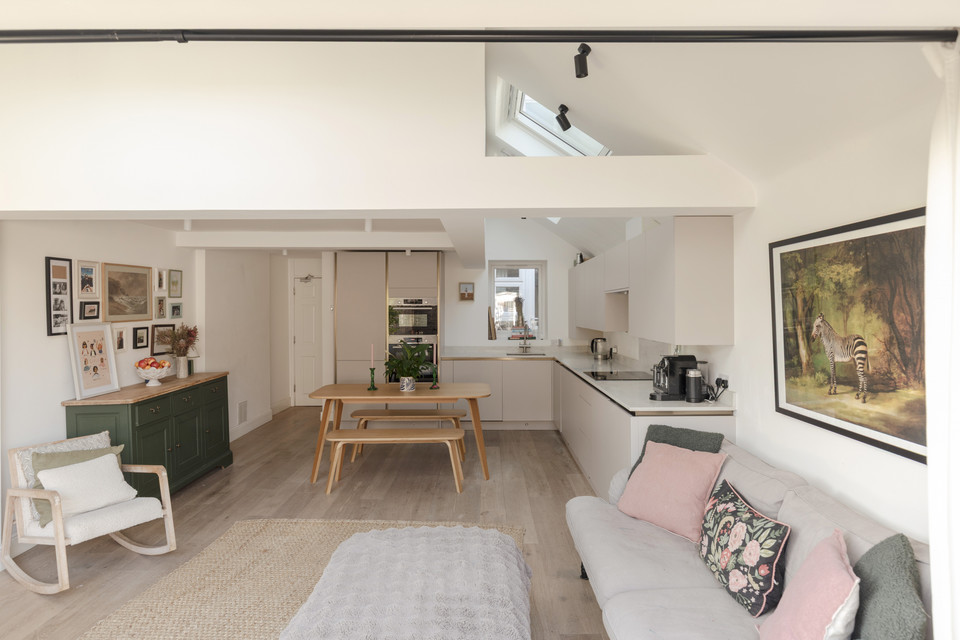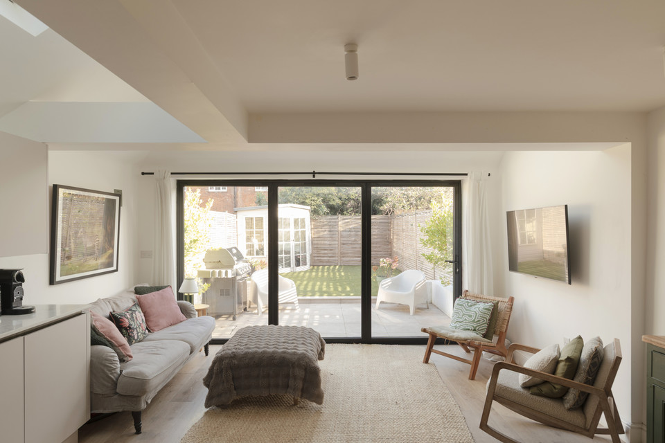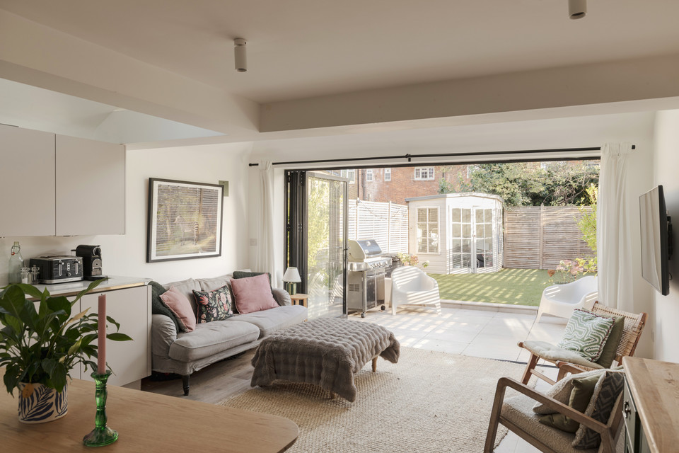 The best bit awaits: your large living room/dining room/kitchen. This is over 21 feet by over 14 feet, with wall-spanning folding doors to the sunny garden. The fitted kitchen is modern in style, with integrated appliances (which are included in the sale). Roofline skylight windows are a great decision over this area.