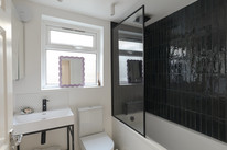 A cupboard in the hall is useful for coats and such. Then on your left you have the property’s windowed bathroom, complete with over-bath shower. A contemporary white suite impresses, teamed with on-trend monochrome detailing.