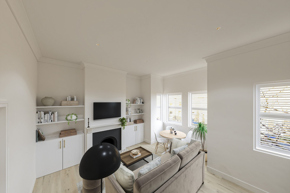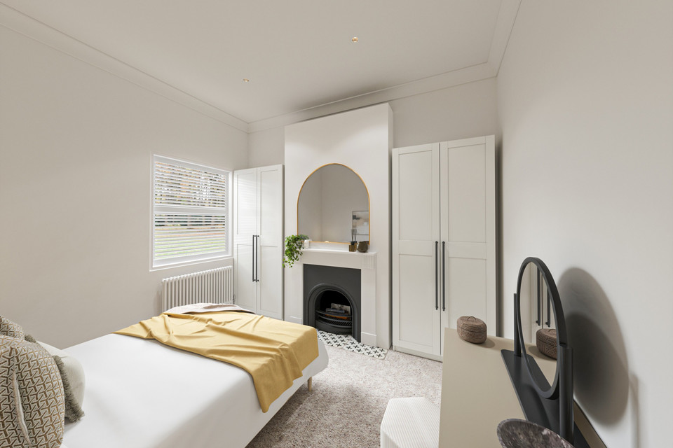 Up the rest of your stairs and bedroom two rests to your left (once again, a good double), while your main room sits across the front of the building. Entertaining-friendly, this is over 5 metres by over 4 metres, with four windows in the square bay (a natural spot for your table and chairs), and a feature fireplace.