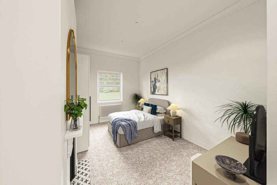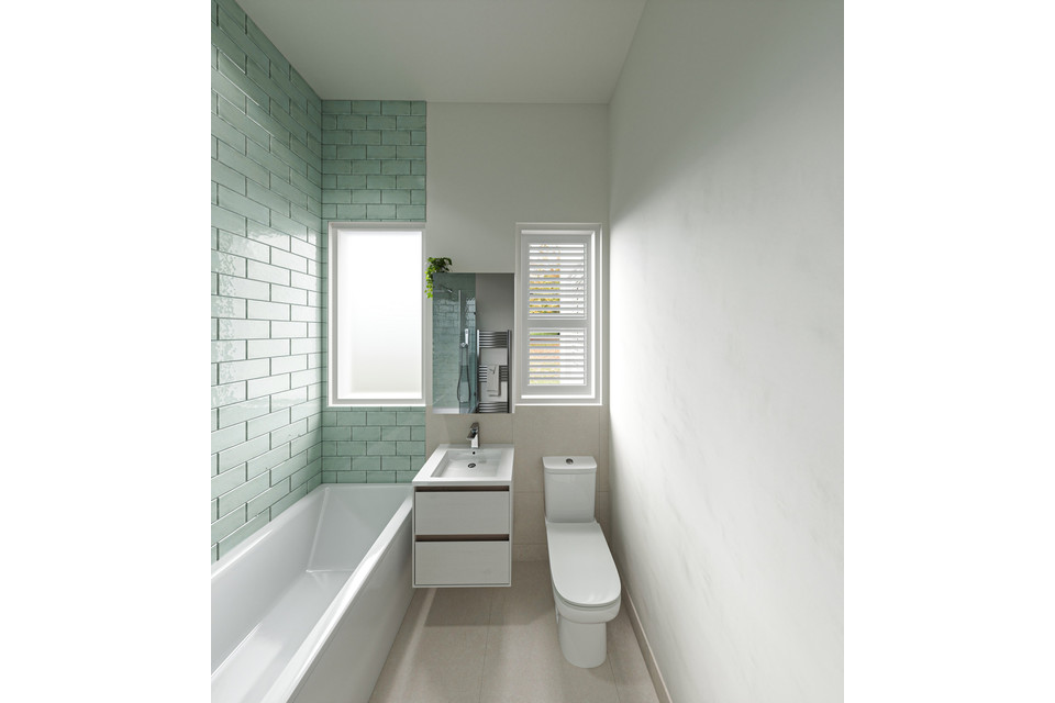 There is a shared main door and you share this and your hall with just two other properties (there are two below yours). Your own front door is on the first floor and once opened, take stairs up to a landing area with bedroom one leading off ahead at the back of the building, and the property’s windowed bathroom (with over-bath shower) set to your right.