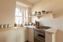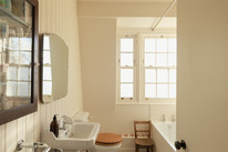 Next along the hall you have your beautiful windowed bathroom with tasteful T&G to one wall, and traditional-style sanitaryware and fittings/taps etc. An over-bath shower gives you both washing options. A neat and useful cupboard sits next to the bathroom door.