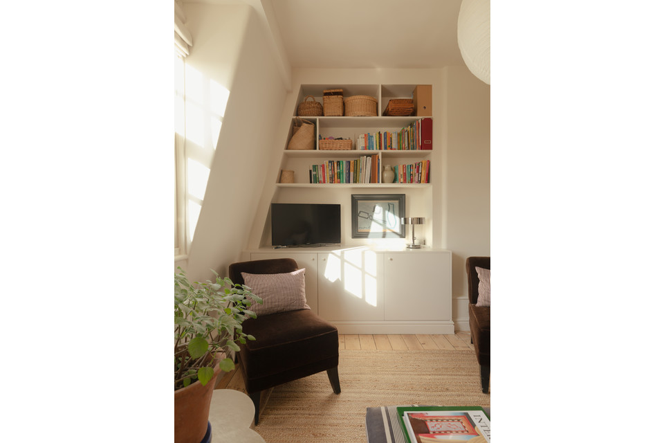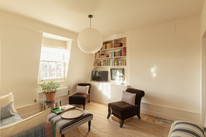 At the top of the hall, enter your big and bright reception room, with bespoke built-in cupboards and shelves to the alcove. This is over 12 feet by over 13 feet, with a southwesterly orientation made extra pleasant by having two windows. Views over Camberwell Green and beyond are noteworthy. Penthouse-life! Once again, stripped and treated wooden boards delight.