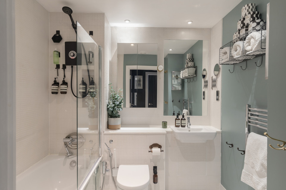 On your right of the hallway is a large single bedroom of 12 feet by 7 feet. It’s currently enjoyed as a home office/dressing room. Adjacent to this room is a large storage cupboard then next along the hall your guest loo then the bathroom (white suite and over-bath shower here).