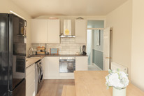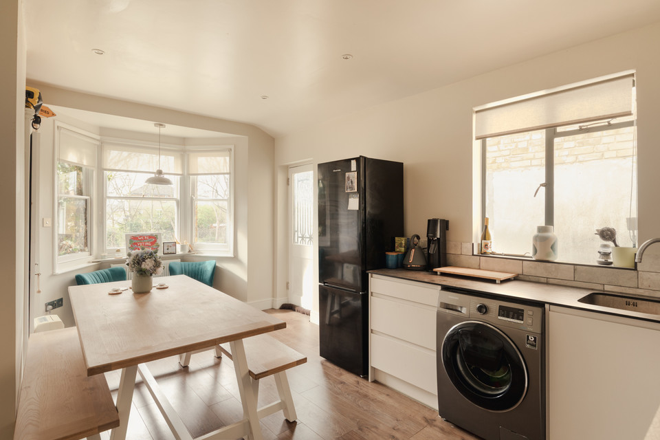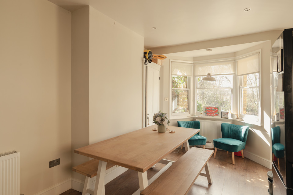 At the rear of the flat you have a delightful double-aspect kitchen/diner, of 18 feet by over 10 feet, with a sunny SW-facing bay window. Fitted units (sans handles) are neat, white and timeless. Engineered oak to the floor is another fab decision.