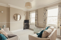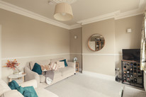 Then across the front of the house you have your large and light carpeted twin-sashed reception room, of over 14 feet by nearly 12 feet. Coving, ceiling rose and dado detail further impress.