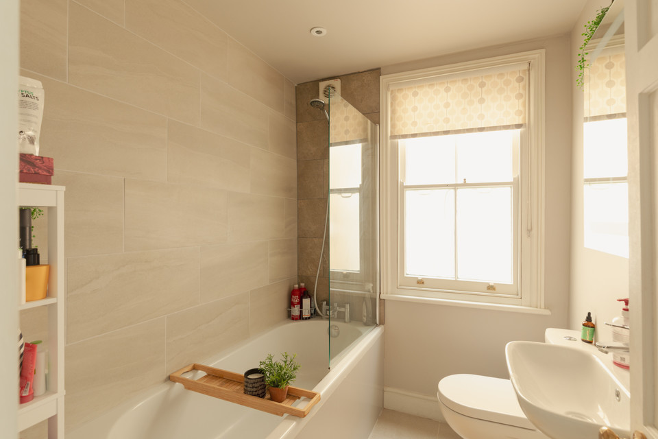 From the shared hall your front door is directly ahead. Open and take your stairs up. From this half-landing area, you have the property’s sash-windowed bathroom to your right. This has modern white sanitary ware and stainless steel fittings, including an over-bath shower. Large profile wall tiles give a fancy hotel feel.