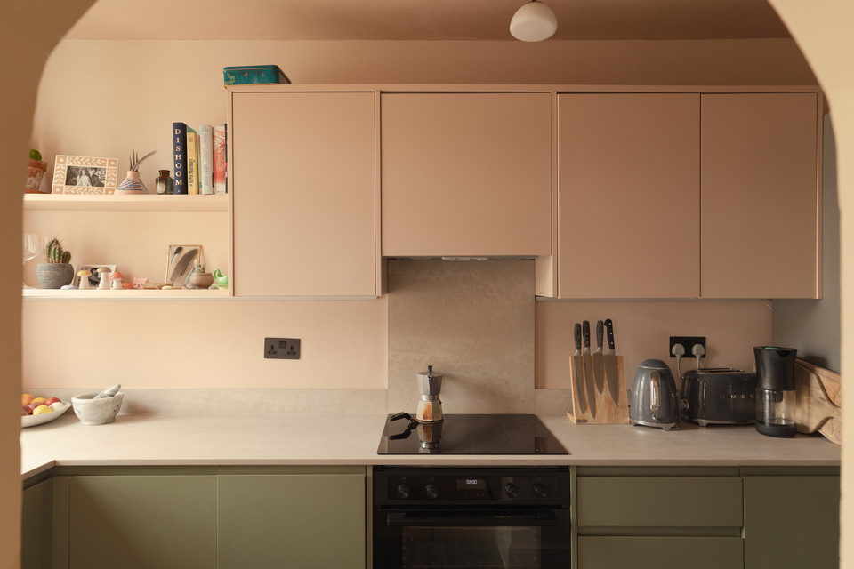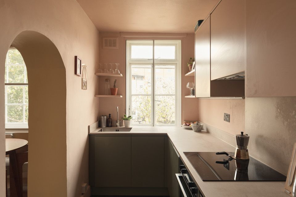 In the main door and take the stars to your own front door on the first floor. You open into a welcoming hall (with a coat closet), with your reception and independent kitchen rests to your right, taking the width of the building. Your large reception room is over 14 feet by over 12 feet, with an attractive central fireplace, smart engineered oak floors, and alcove shelving (shelves, walls and ceilings are all a delightful nude hue). Your kitchen has matt modern wall and base units in two tones, teamed with stone worktops and open shelves, too. Integrated appliances are included in the sale.