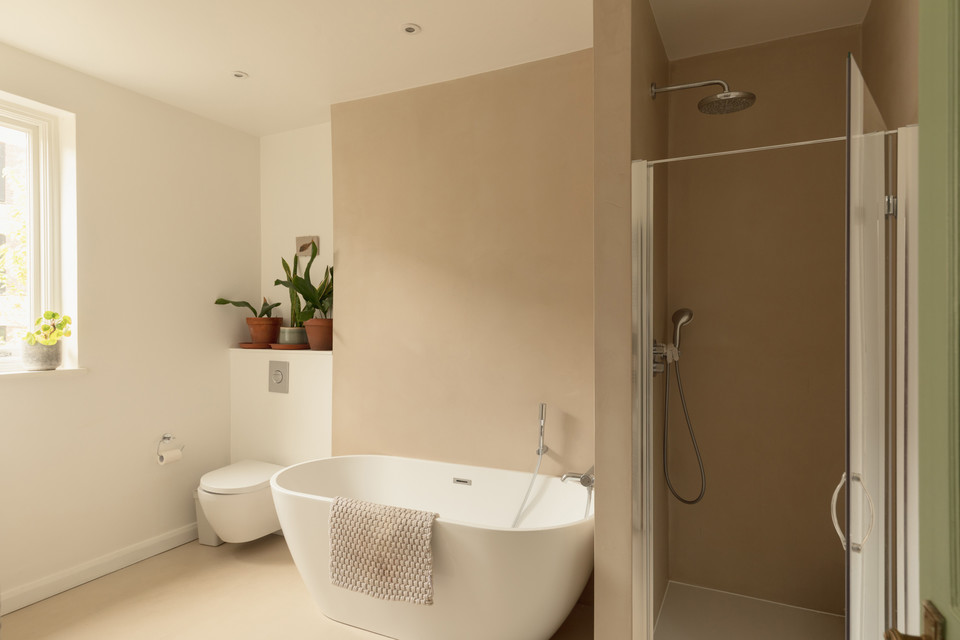 The bathroom is on this floor, with casement window, recessed lighting, contemporary sanitaryware (including a free-standing tub) and an independent shower. You also have a plumbed utility cupboard.