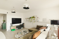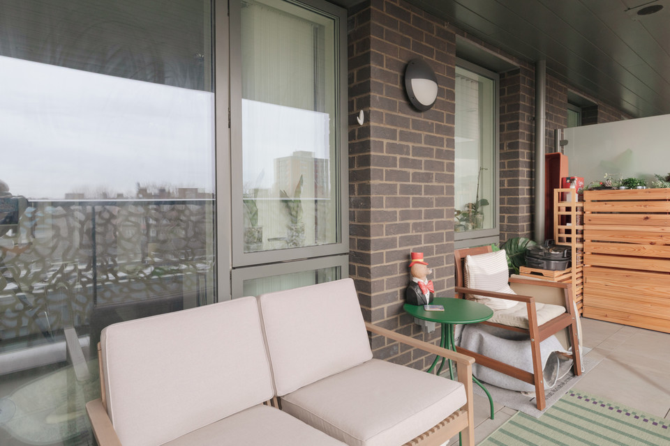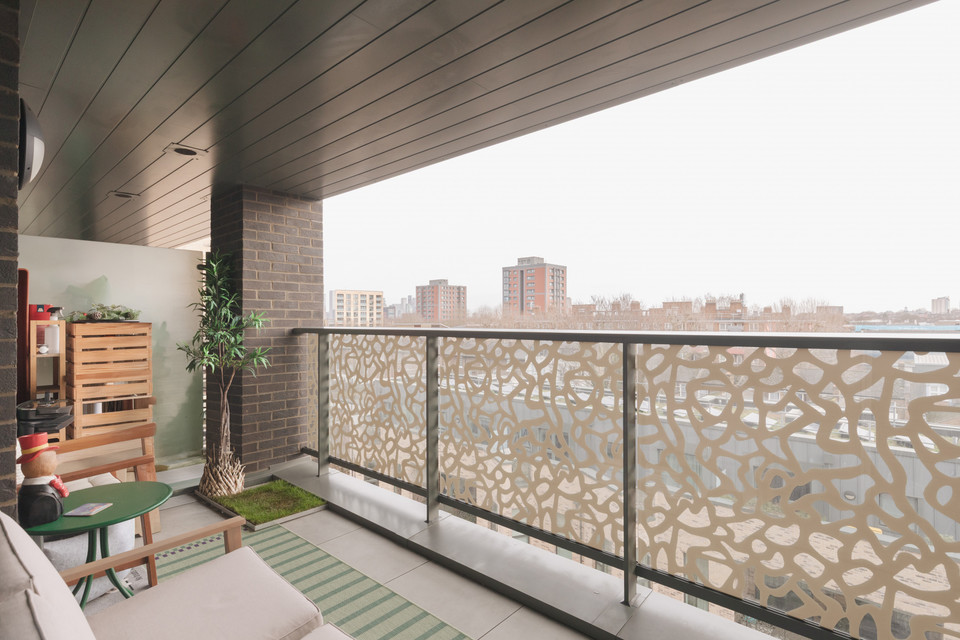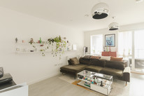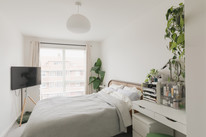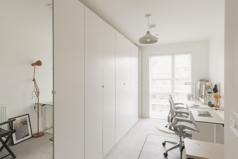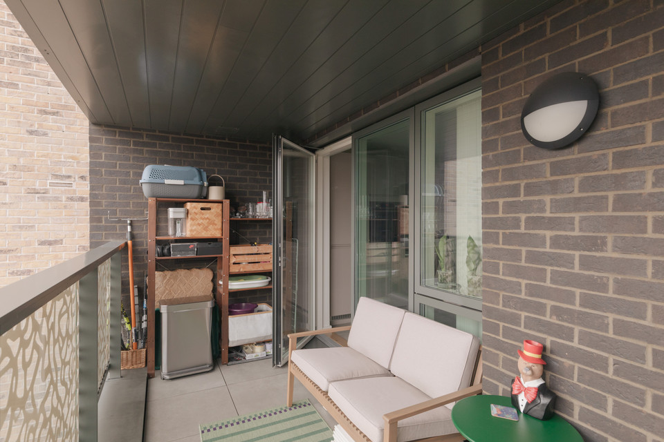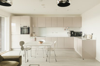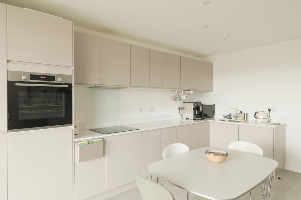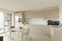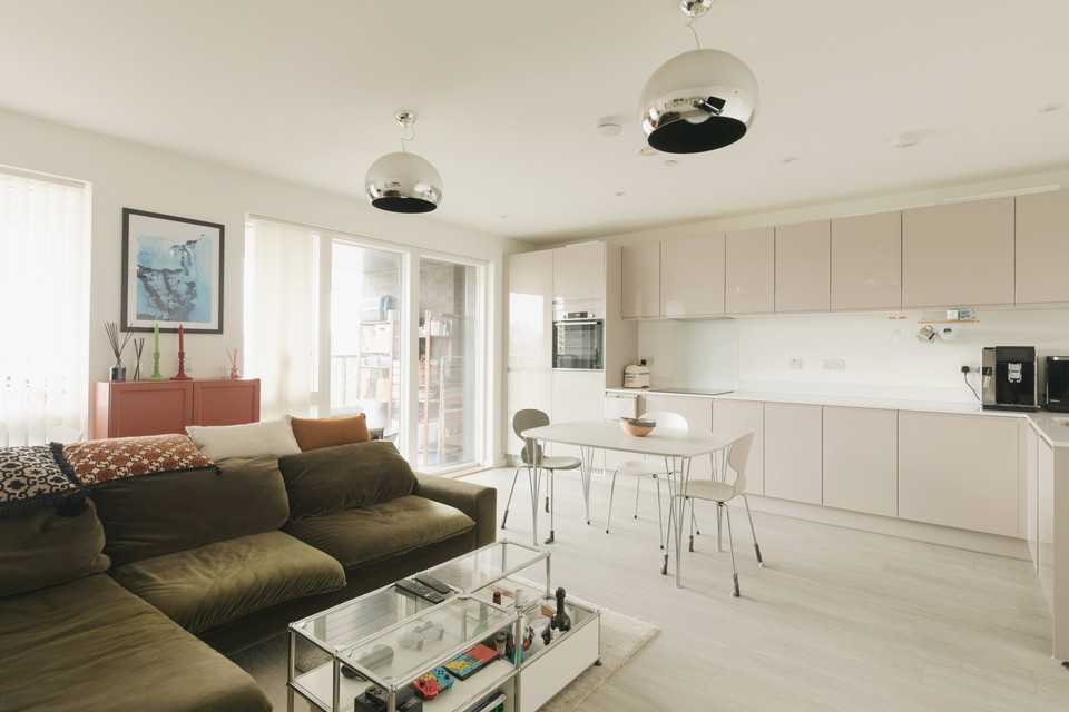 To your right you have your main room with loads of space for your kitchen, dining and and seating areas. Fitted units are a timeless modern style. As throughout, decor is bright and white. An east-facing covered private balcony is accessed from this room. Morning sun impresses here, as do views over pretty Georgian maisonettes.