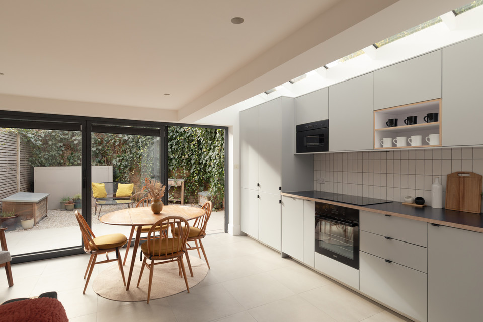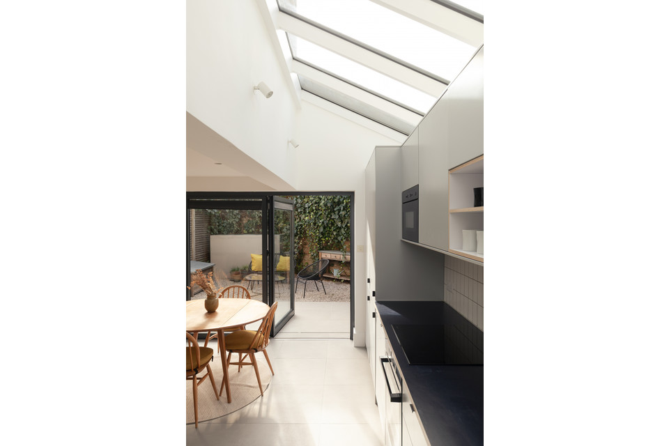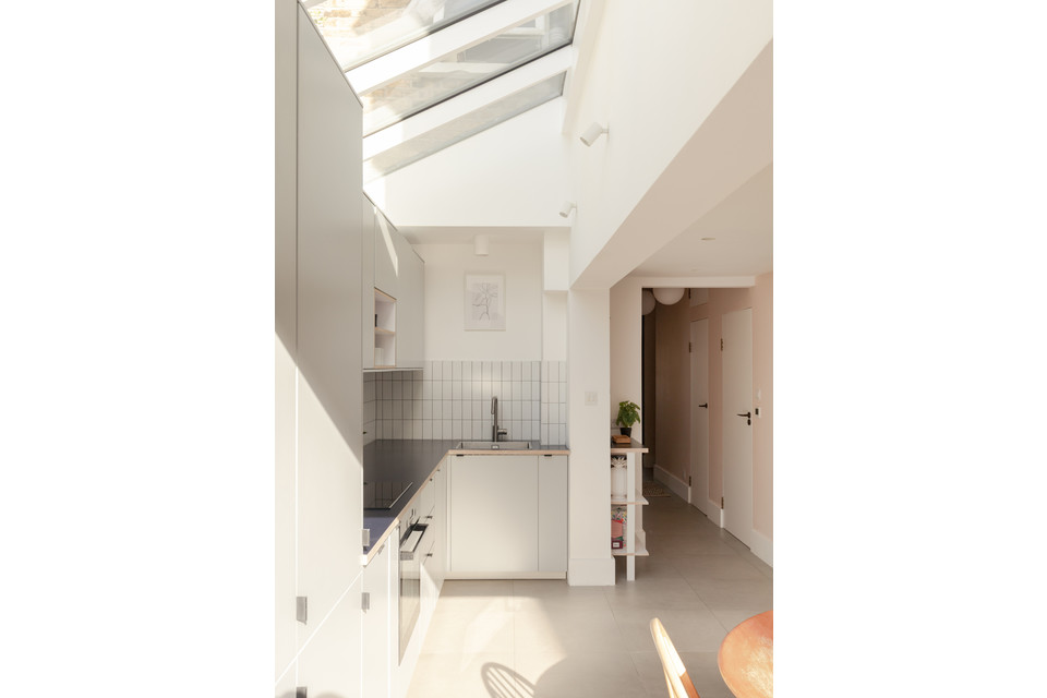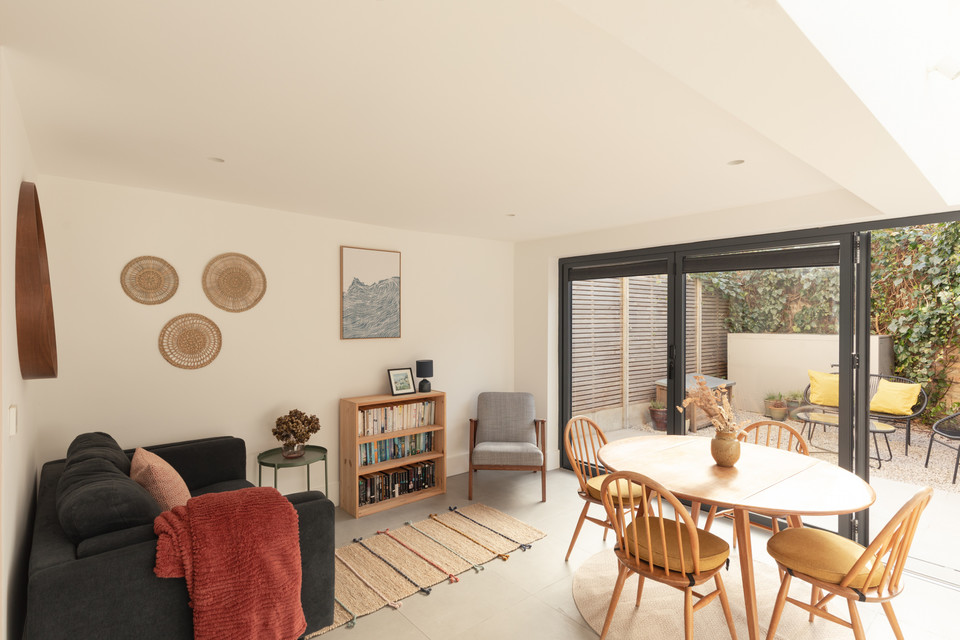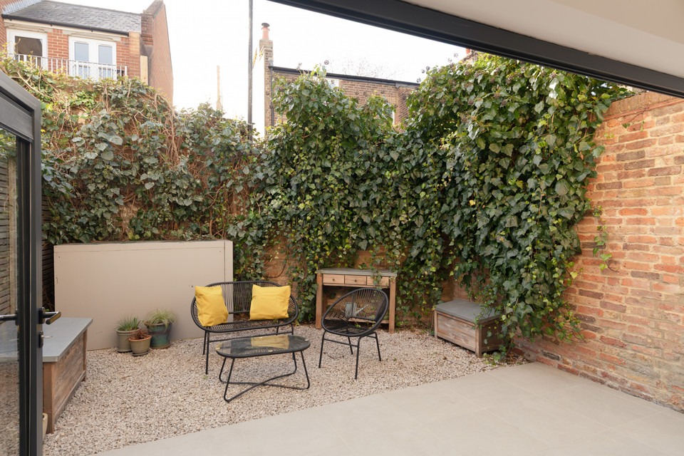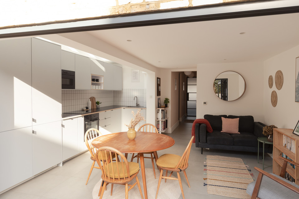 At the back of the flat is your main event: a big and bright open-plan room onto the low-maintenance garden, with a bank of modern kitchen units (integrated appliances are included in the sale) set in a recent extension to the original footprint (which was once the side-return). The space measures over 14 feet by over 15 feet.