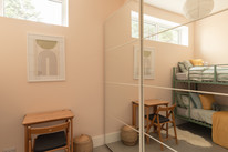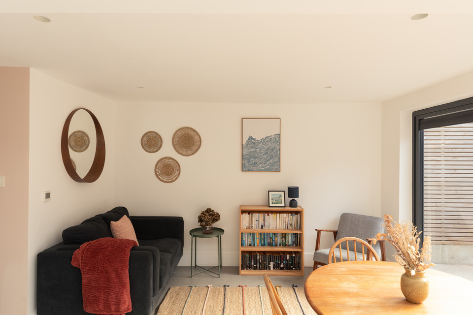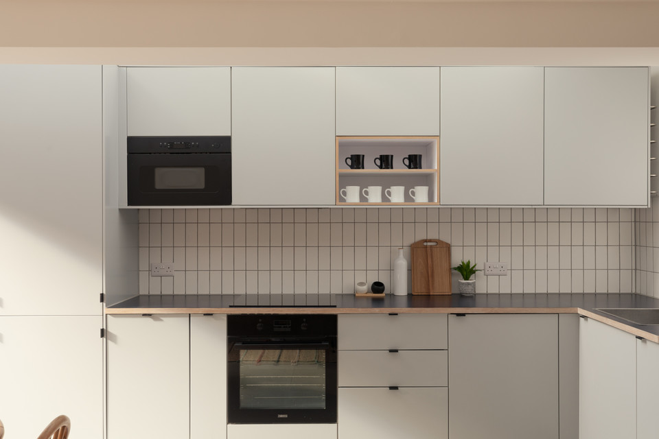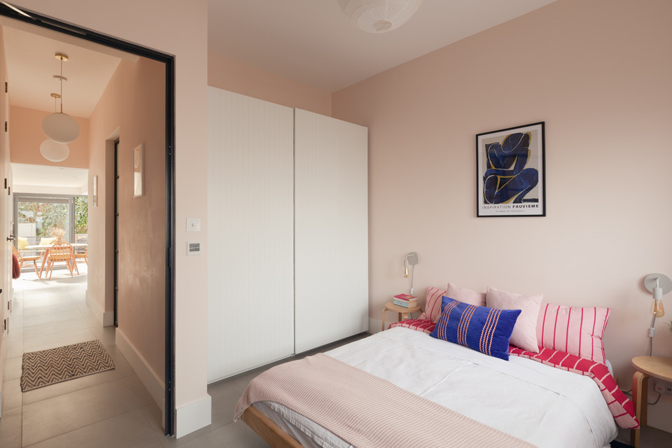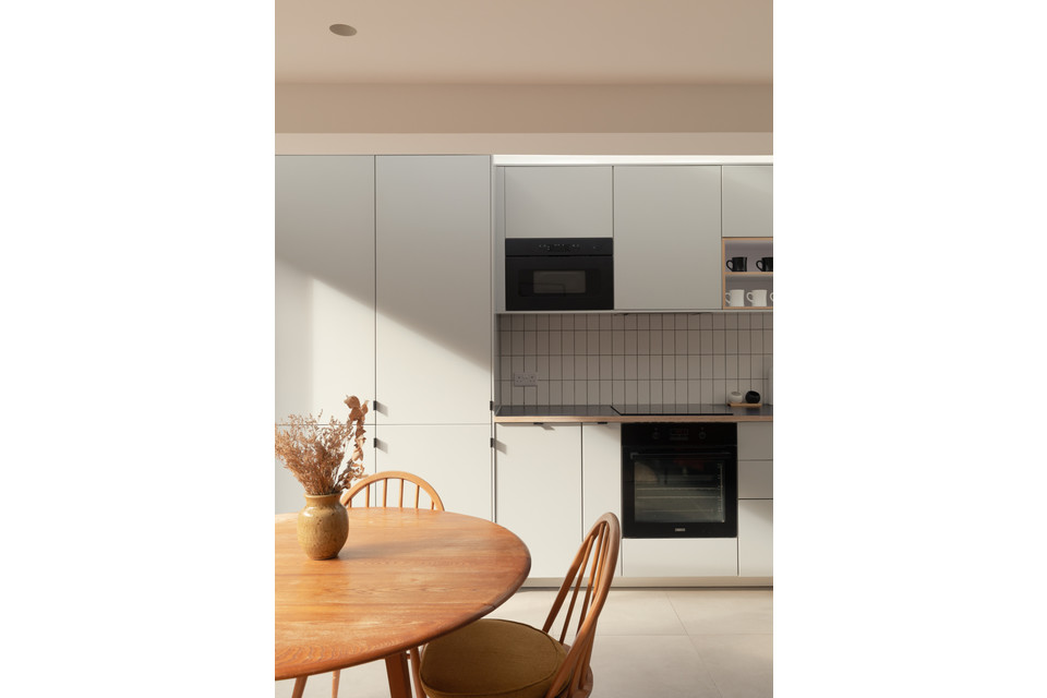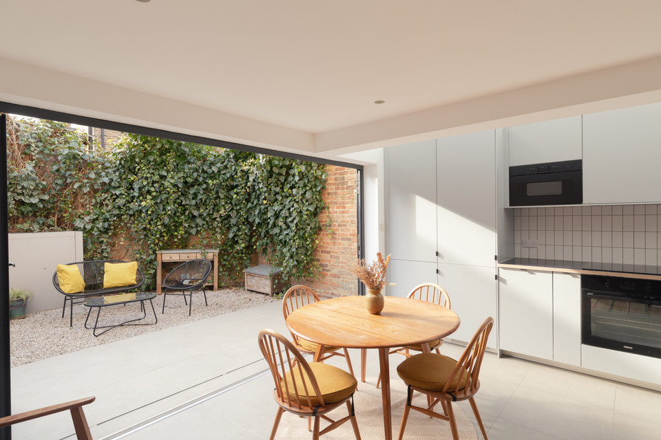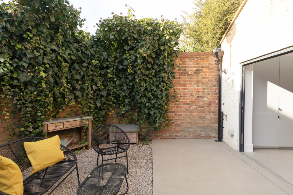 At the back of the flat is your main event: a big and bright open-plan room onto the low-maintenance garden, with a bank of modern kitchen units (integrated appliances are included in the sale) set in a recent extension to the original footprint (which was once the side-return). The space measures over 14 feet by over 15 feet.