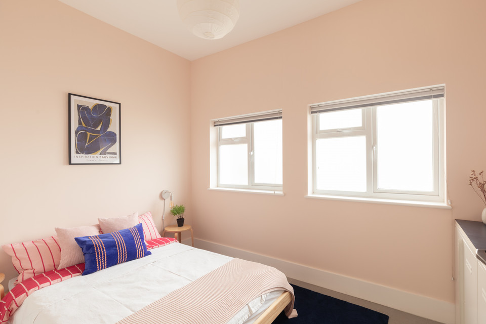 There is a shared hall with the one flat above. Take a right for your own front door. Your principal bedroom is to your right, to the front of the building. It is over 11 feet each way, with a pair of double-glazed windows. Smart large profile tiles flow through from the hall (and throughout the property).
