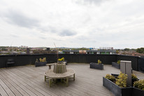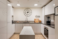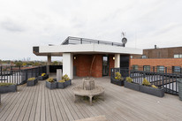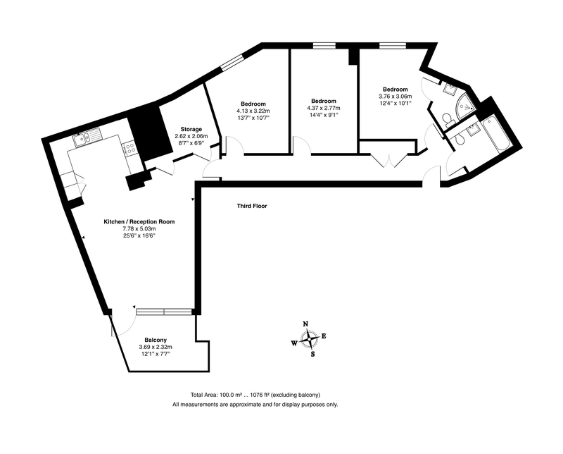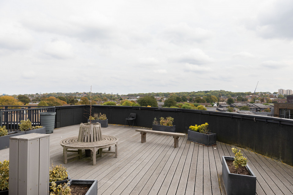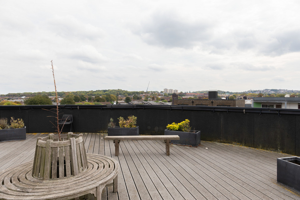 Whopper of a third floor apartment with three double bedrooms and both bath and shower rooms (the shower room is en suite the the principal). The cherry on top is a south-facing covered/year-round balcony with a leafy outlook. There are large and easily-accessed communal roof and first floor terraces, too.