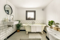 To the right of the hall is a larger than average windowed bathroom with a roll-top bath, a separate independent shower, and metro-style tiling.
