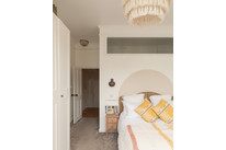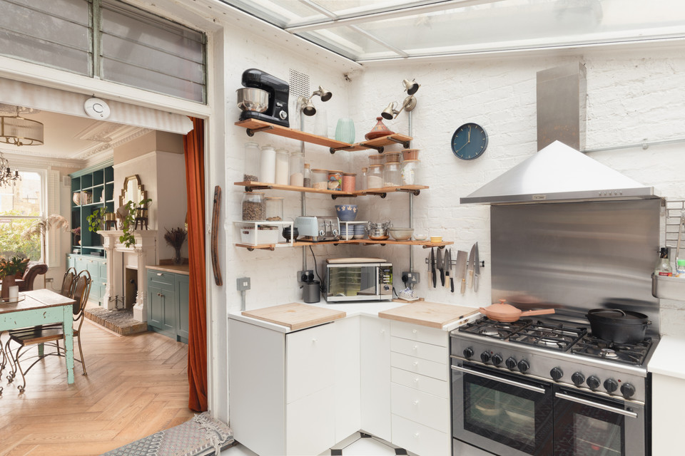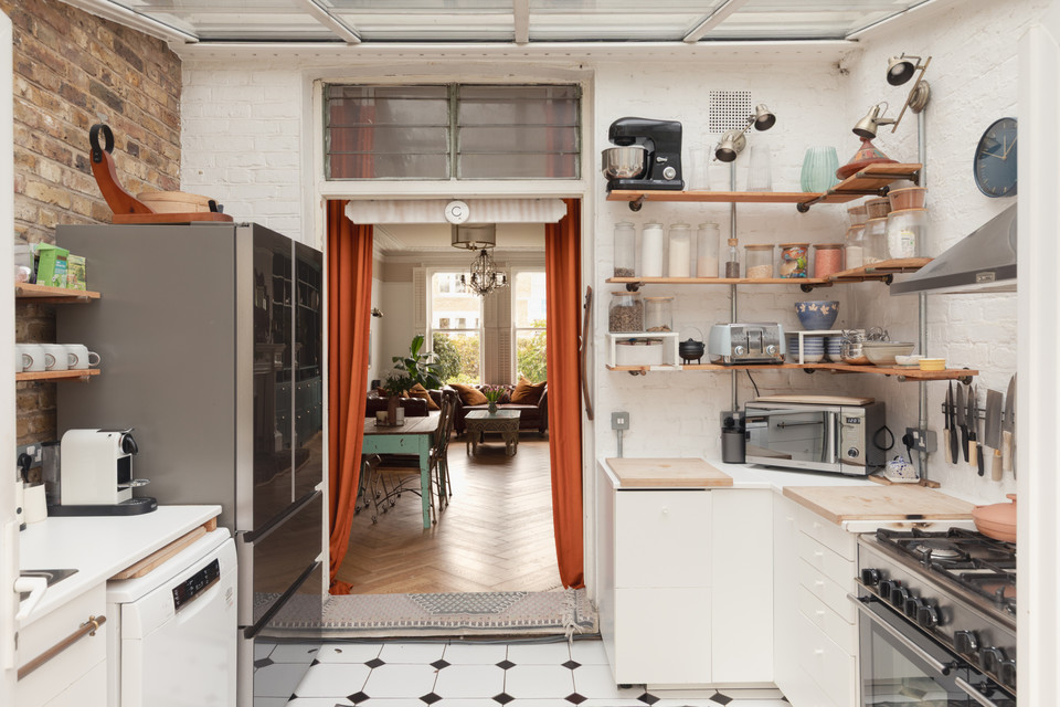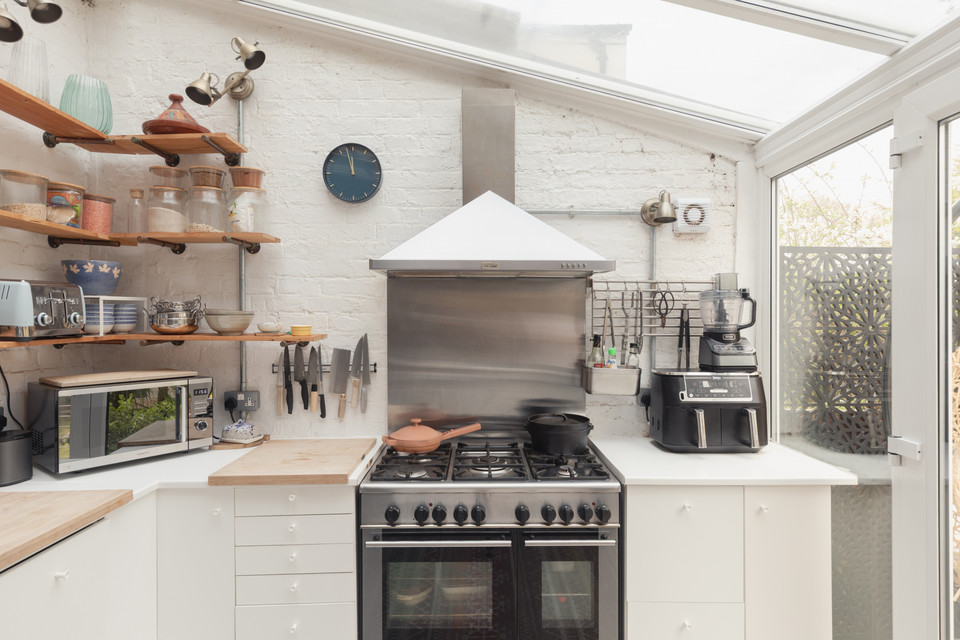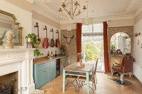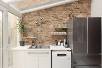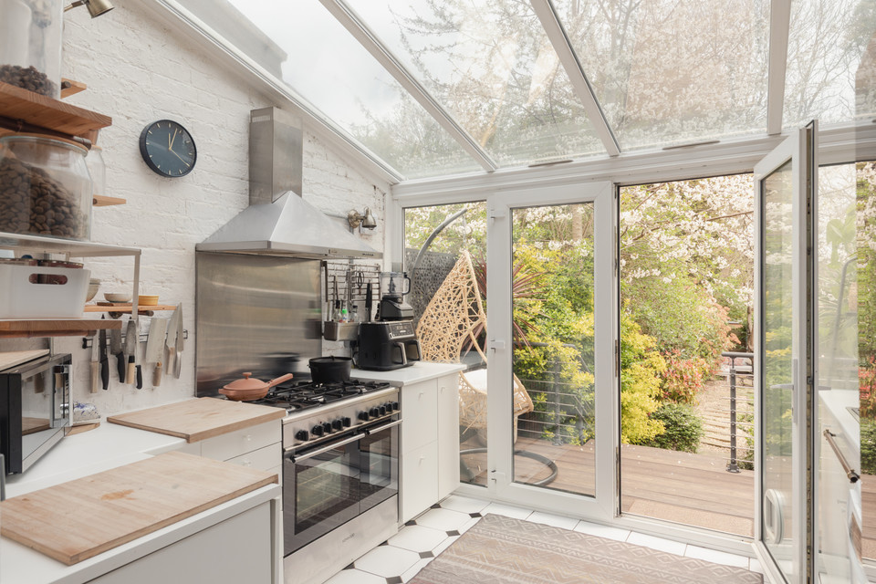Your conservatory-kitchen is set beyond this room, with simple white units, exposed brick detail, and double-glazed double doors out to your sensational garden (we will come back to this!).