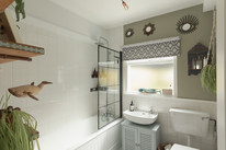 At the end of the hall you have some useful built-in cupboards and access to your useful basement (reduced headroom), then your main bathroom, which has a neat white suite, a casement window, and an over-bath shower.