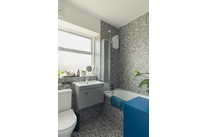 The property’s bathroom completes the tour - a contemporary affair with cool terrazzo tiles and shower over the bath.