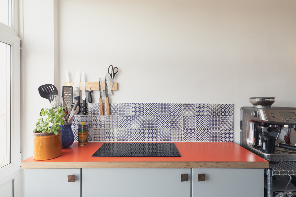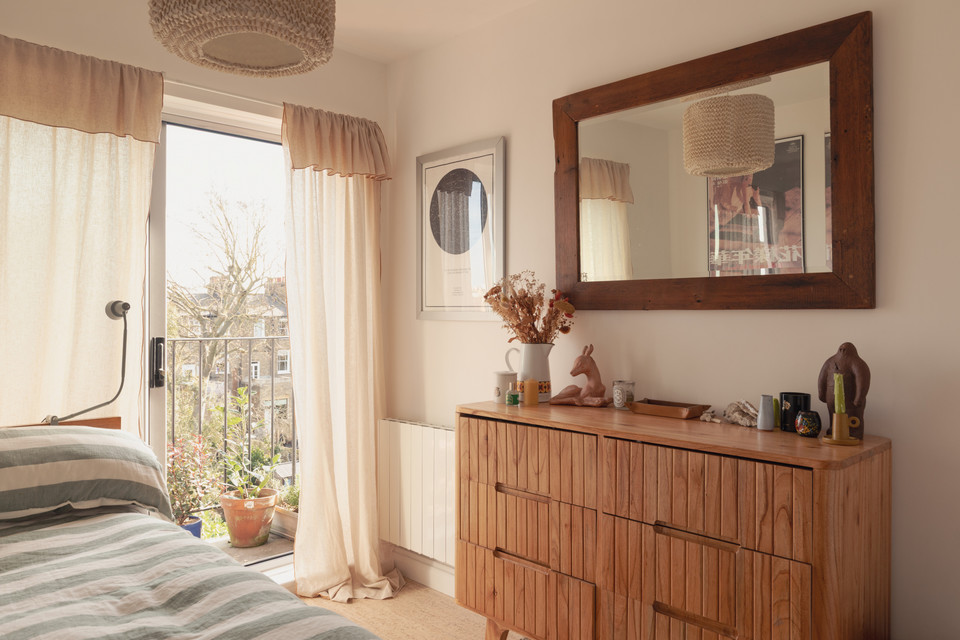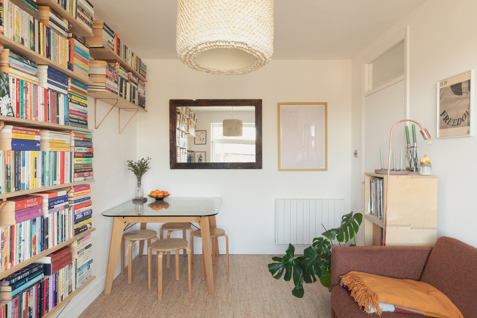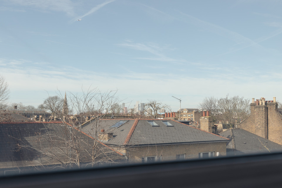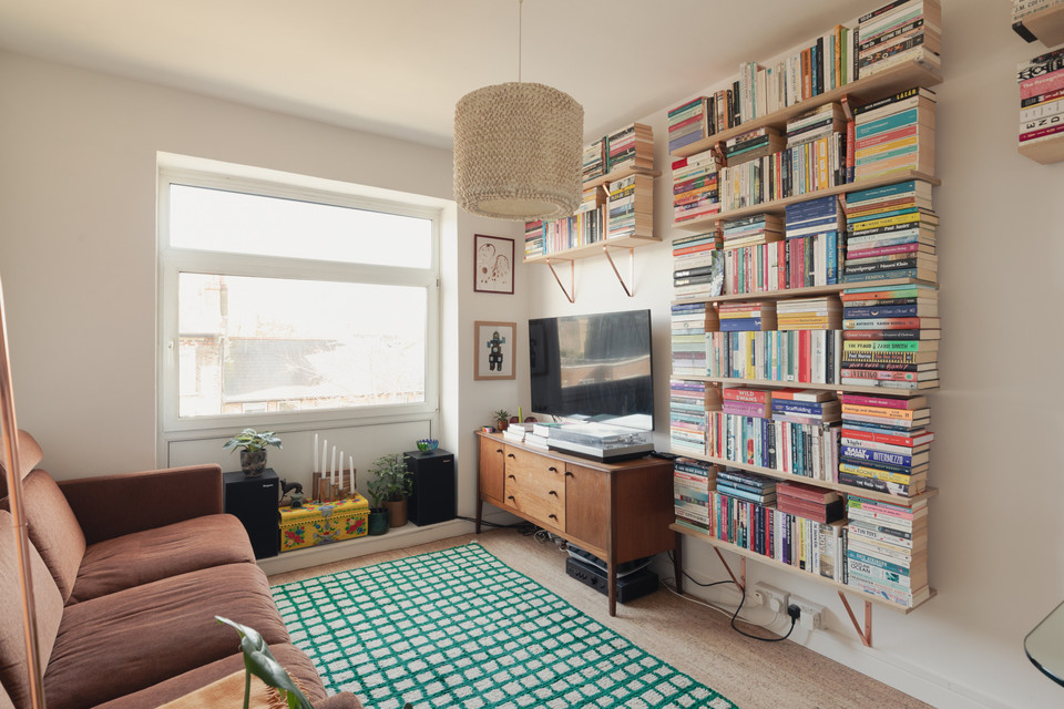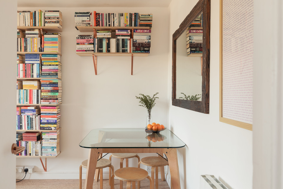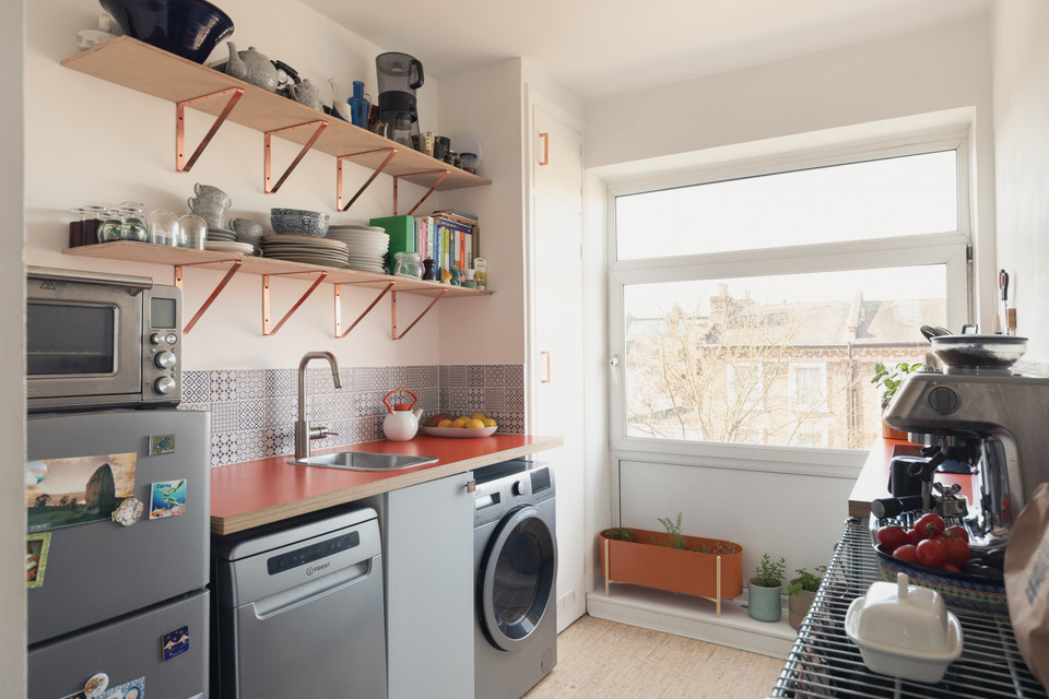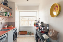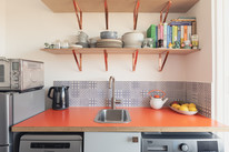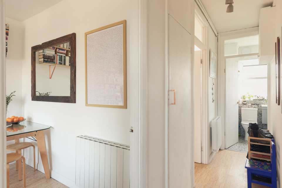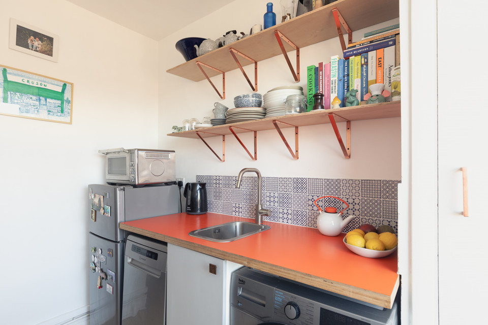 Through a main shared door and you take the stairs to the third floor and your own front door. On entry, first on your left is the independent kitchen, with a west-facing window. The room has been fitted-out in a modern style, with notable coated ply counters and open-shelf detail.