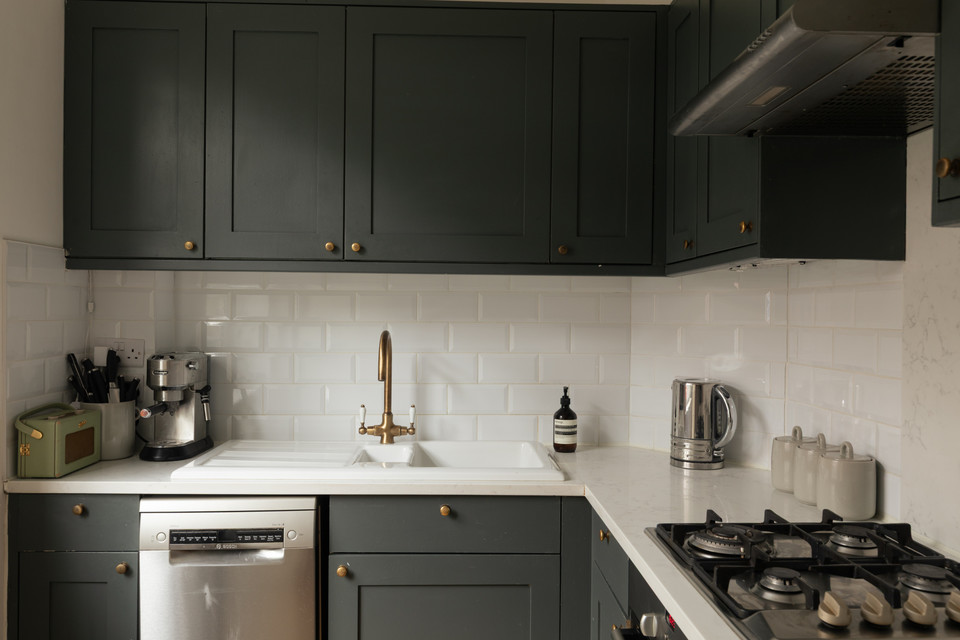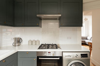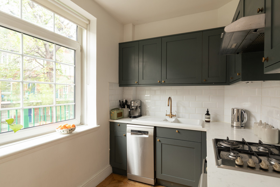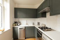 Your west-facing fitted L-shaped kitchen has timeless units in a Shaker style, topped with quartz counters.
