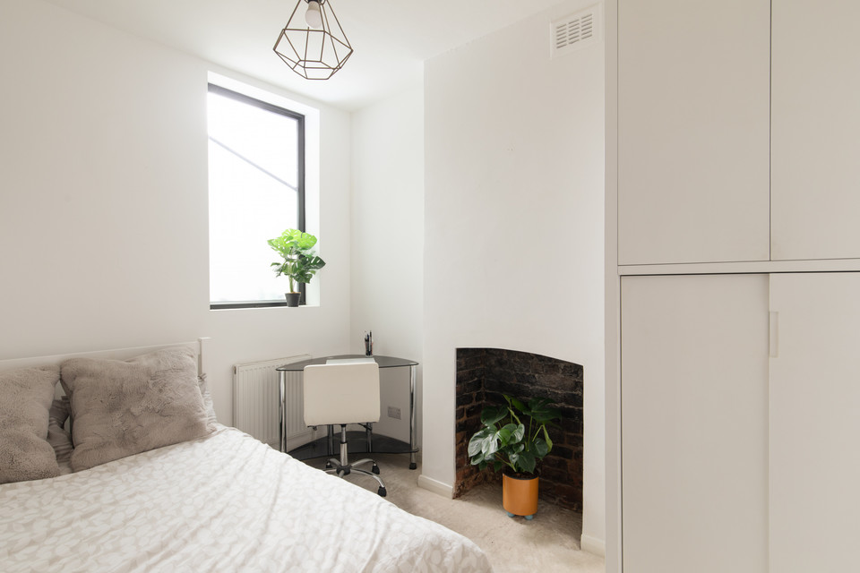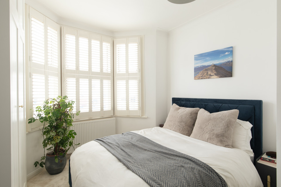 You have just one flat above yours and you share an entrance hall. Your front door is set to your right. Straight ahead on entry you have your principal bedroom, of over 13 feet by over 11 feet, with a big bay window (custom-made shutters here), neat white walls, pale carpet, built-in wardrobes (pleasingly to the ceiling), and an accent wall with opened-up fireplace.