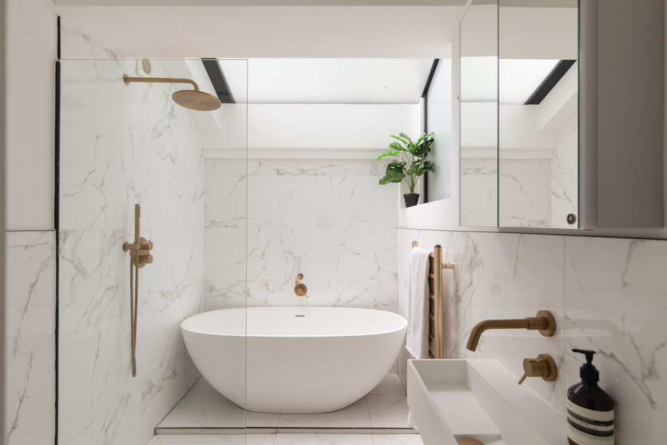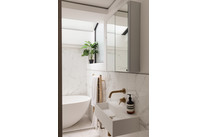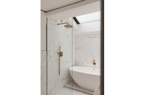 There is a useful cupboard (ideal for coats/shoes/cleaning bits) on your left as you move down the hall, then next on your right is the well-designed and beautiful bathroom, with cool pocket door, contemporary sanitaryware and fittings (including a wetroom style shower with separate shower attachment), concealed plumbing, and modern glazing.